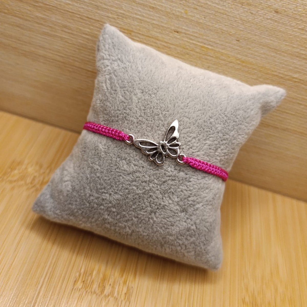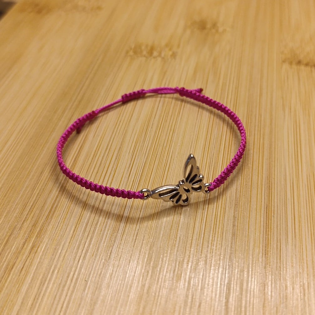 Náramek tkaný technikou macramé z C-lonu odstín fluo hot pink, kovový motýl ve stříbrné barvě.Posuvné zapínání.