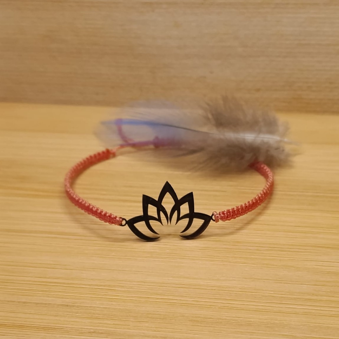 Náramek tkaný technikou macramé z C-lonu odstín chinese coral - růžová, kovový lotosový květ ve stříbrné barvě.Posuvné zapínání.