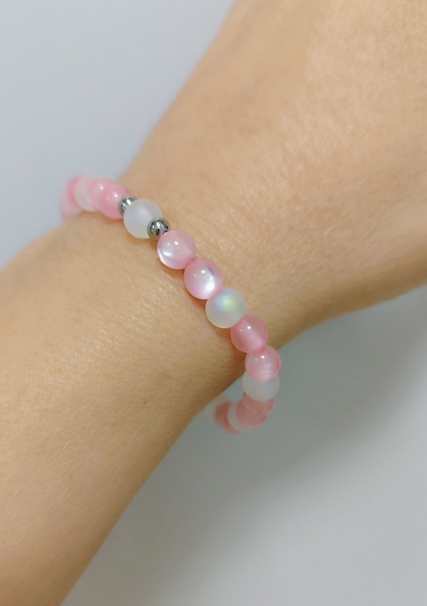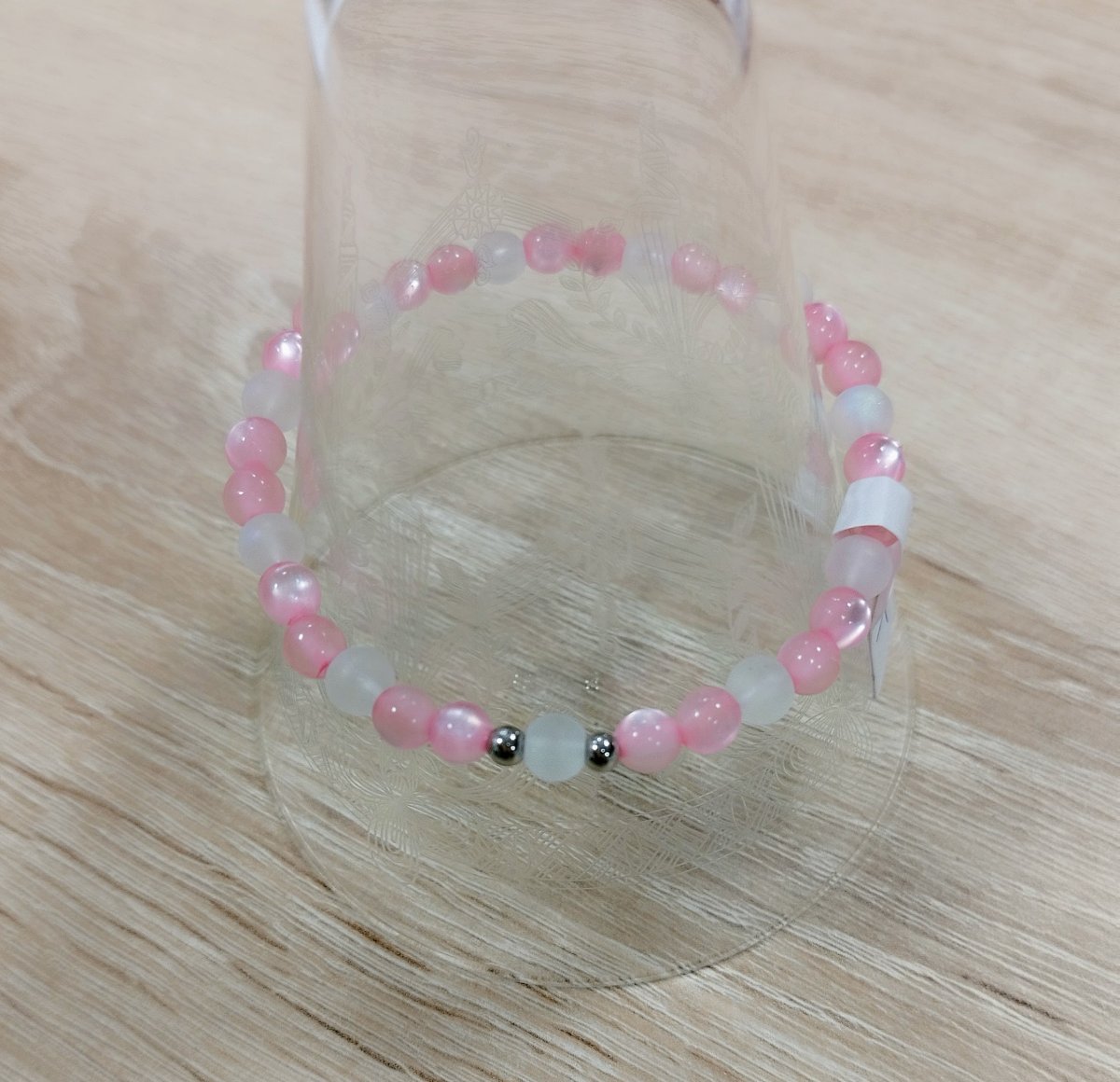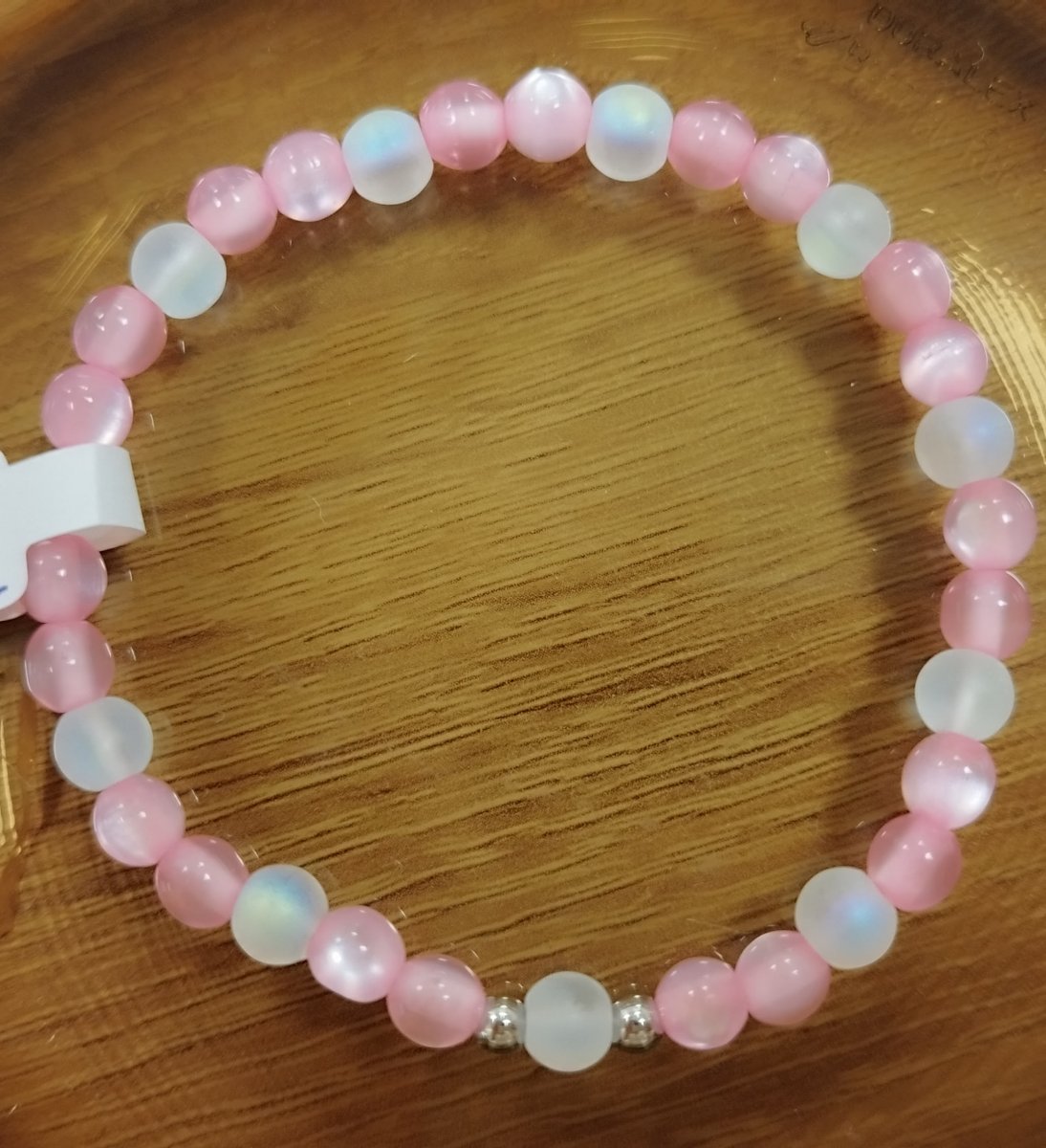 Barva: světlejší růžová, v kombinaci s bílou, efekt duhování, 2 kovové korálky z nerez oceli