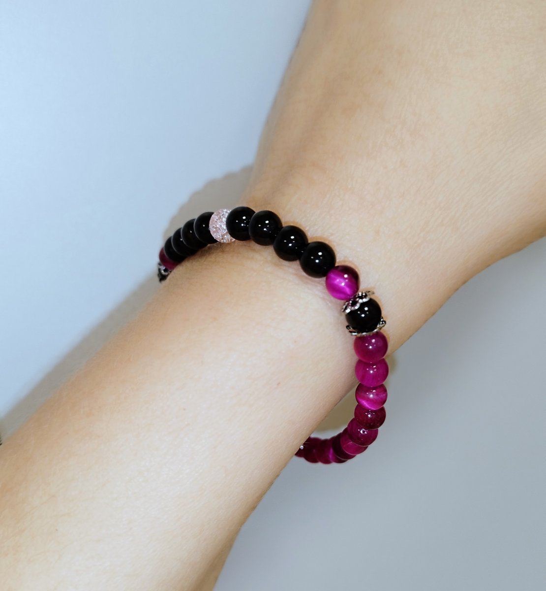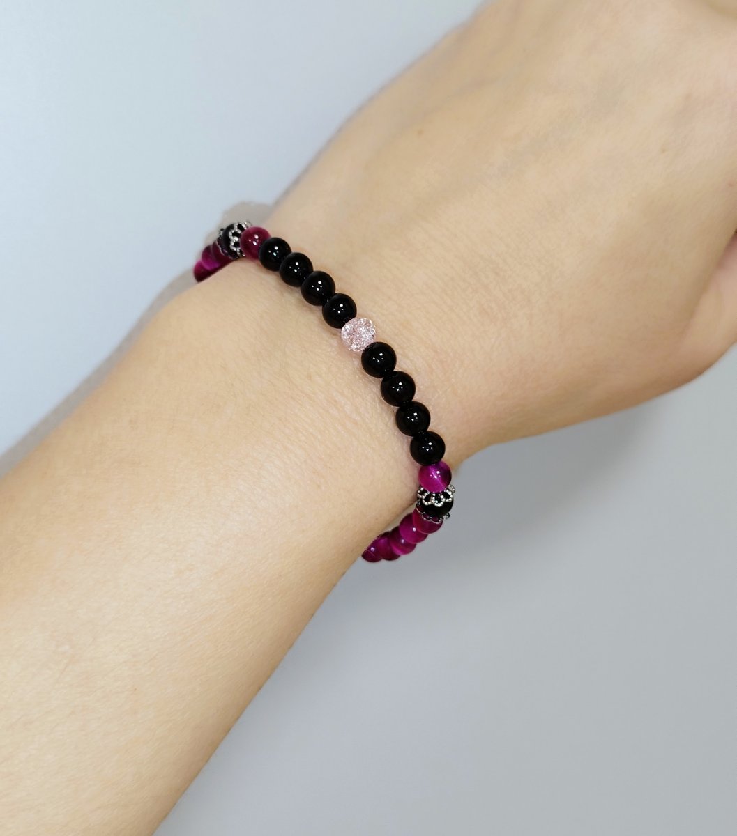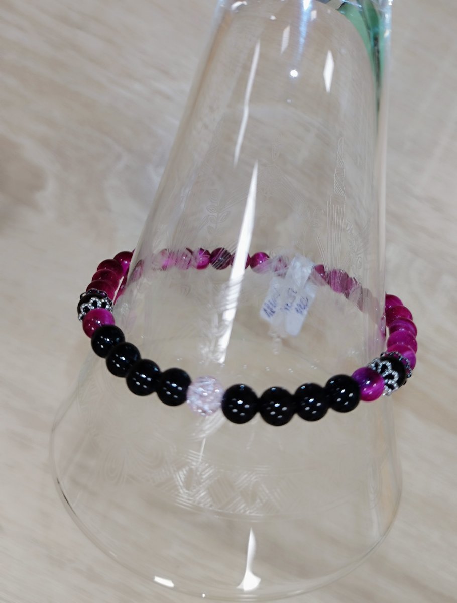 Barva: Tmavě růžová až bordó v kombinaci s černou, 1 korálek světle růžový - práskané sklo