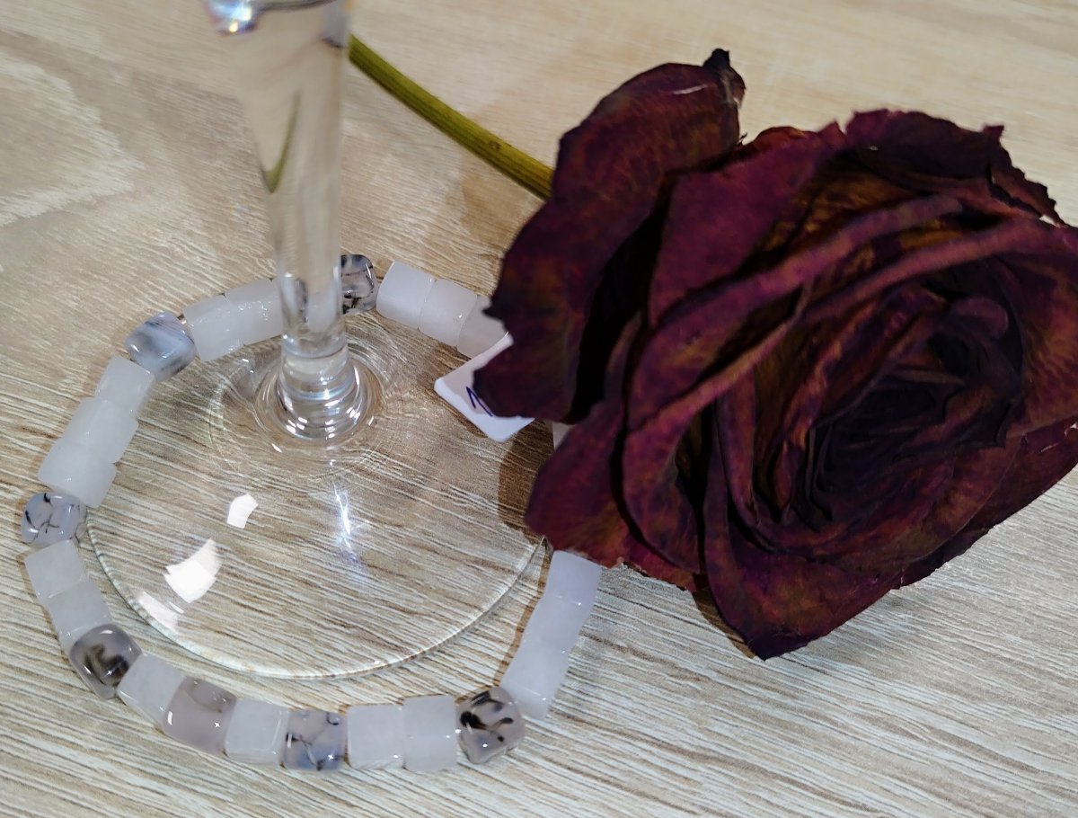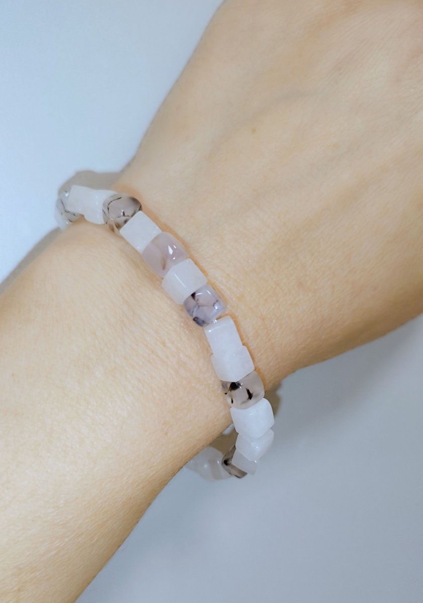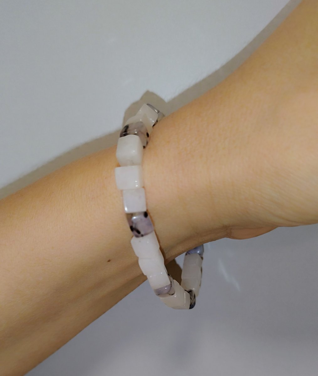 Netradiční pružný náramek ze skleněných korálků ve tvaru kostiček na širší zápěstí