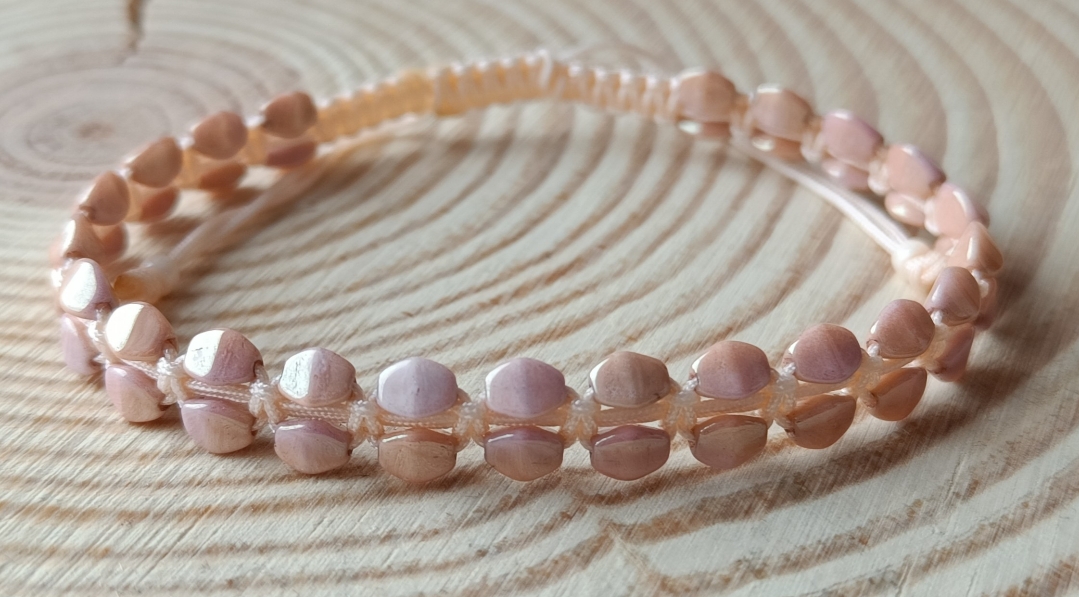 Náramek je vyroben z nylonové šňůry meruňkové barvy. Dále skleněnými korálky.