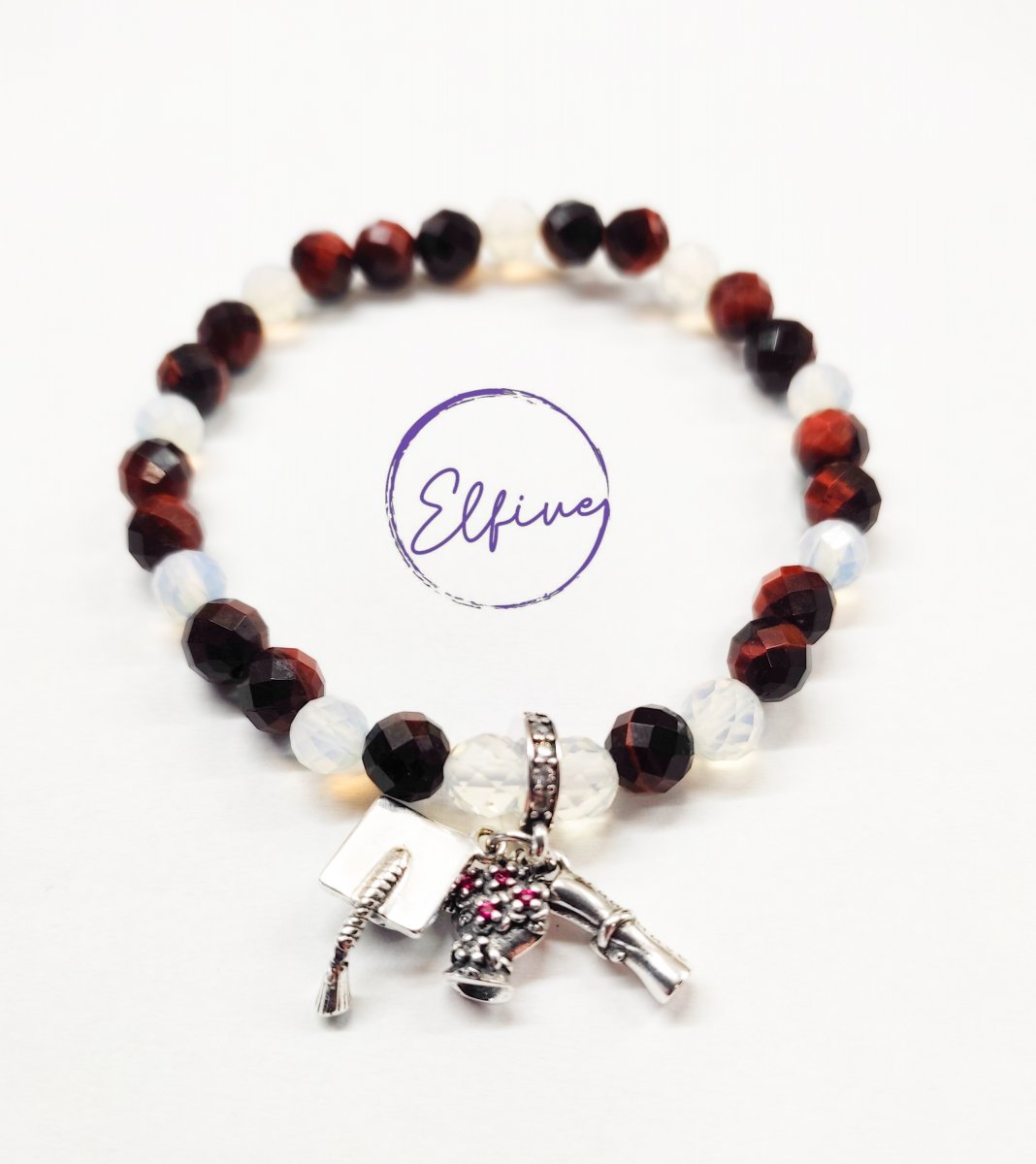 Náramek je vytvořen z minerálních, broušených korálků, se stříbrným přívěskem, který vyznačuje studium (diplom, absolventský klobouk a květina).