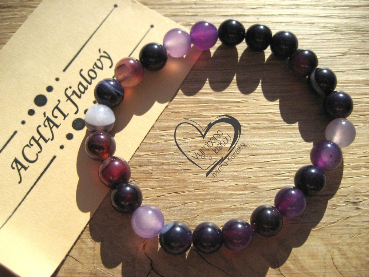 Náramek z minerálu Achát fialový, velikost korálků 8mm, obvod cca 18-18,5cm, kuličky jsou navlečeny na elastické gumičce - lycře, foto je ilustrační, protože každý náramek je originál, tudíž se může nepatrně lišit odstínem barvy či velikosti minerálních kuliček.