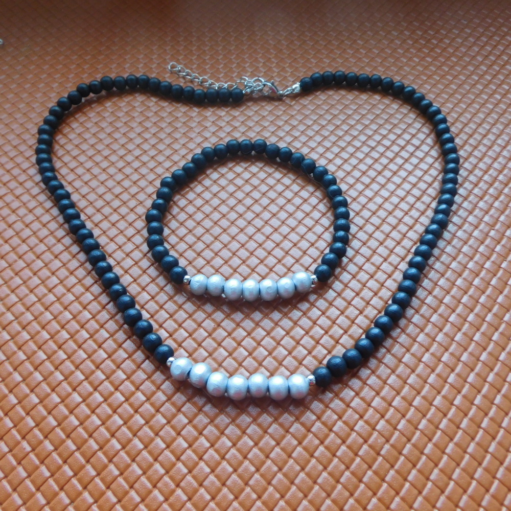 Náramek je vyrobený z černostříbrných dřevěných lakovaných korálků.....