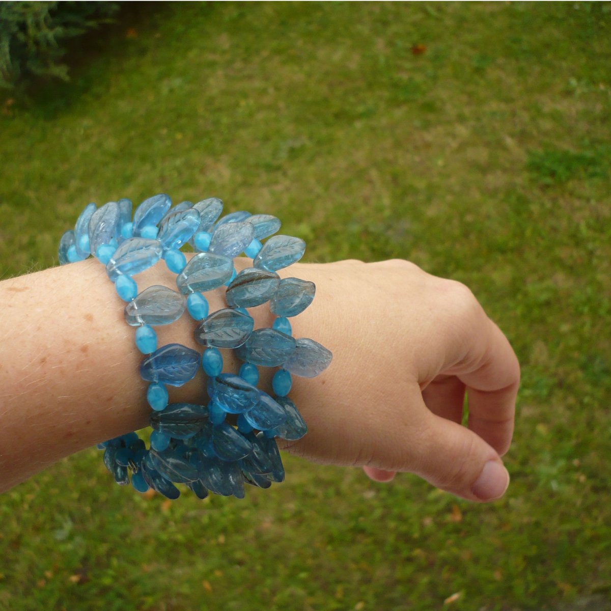 Velké modré žíhané skleněné korálky jsou podle vlastního návrhu navlečeny na čtyřech řadách paměťového drátku (= i přes velké roztažení se náramek vrátí do původního tvaru).