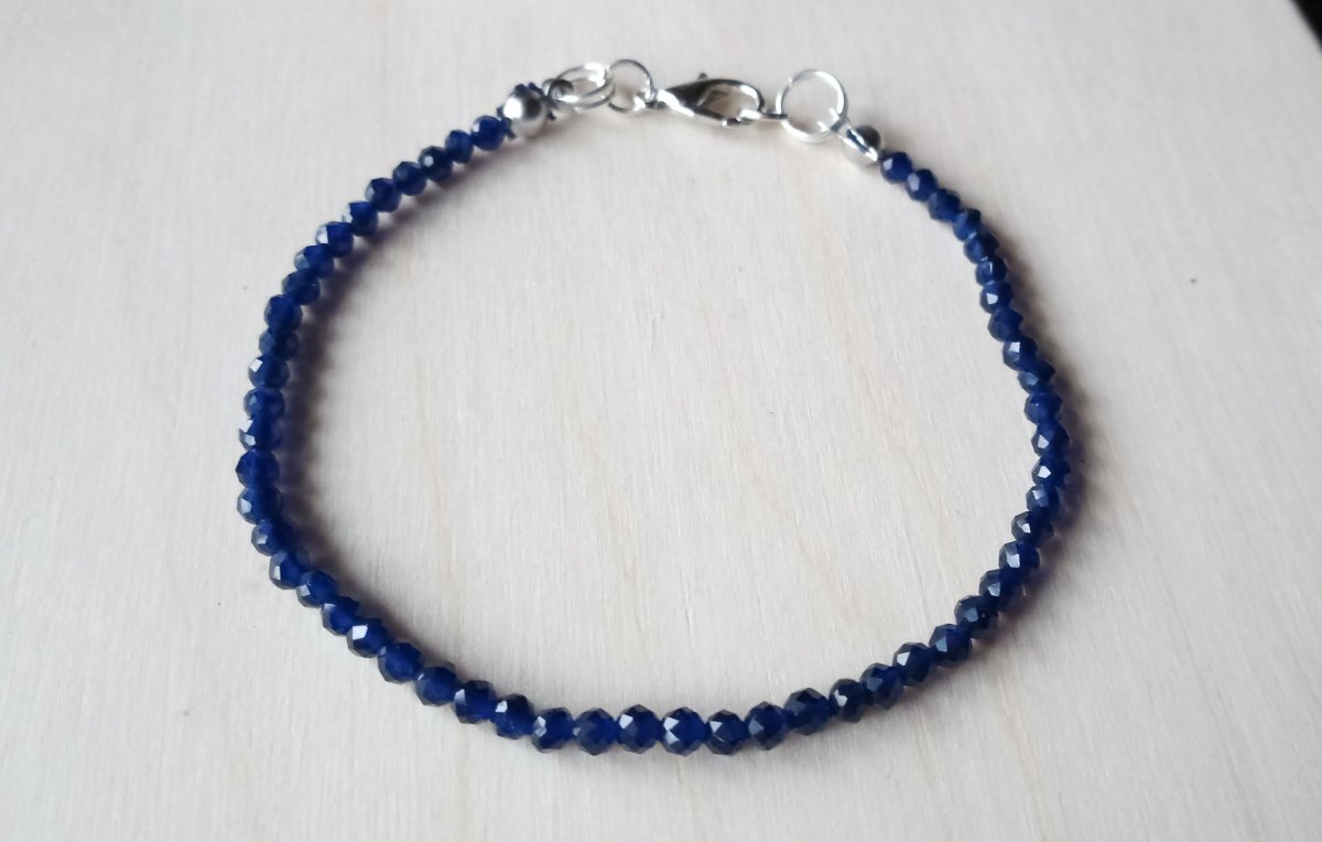 Luxusní náramek z fasetovaného nejjemnějšího modrého safíru vysoké AAA kvality. Průměr jednotlivých broušených drahokamů 2,5 mm, navlečené na hedvábí s ocelovou karabinkou.