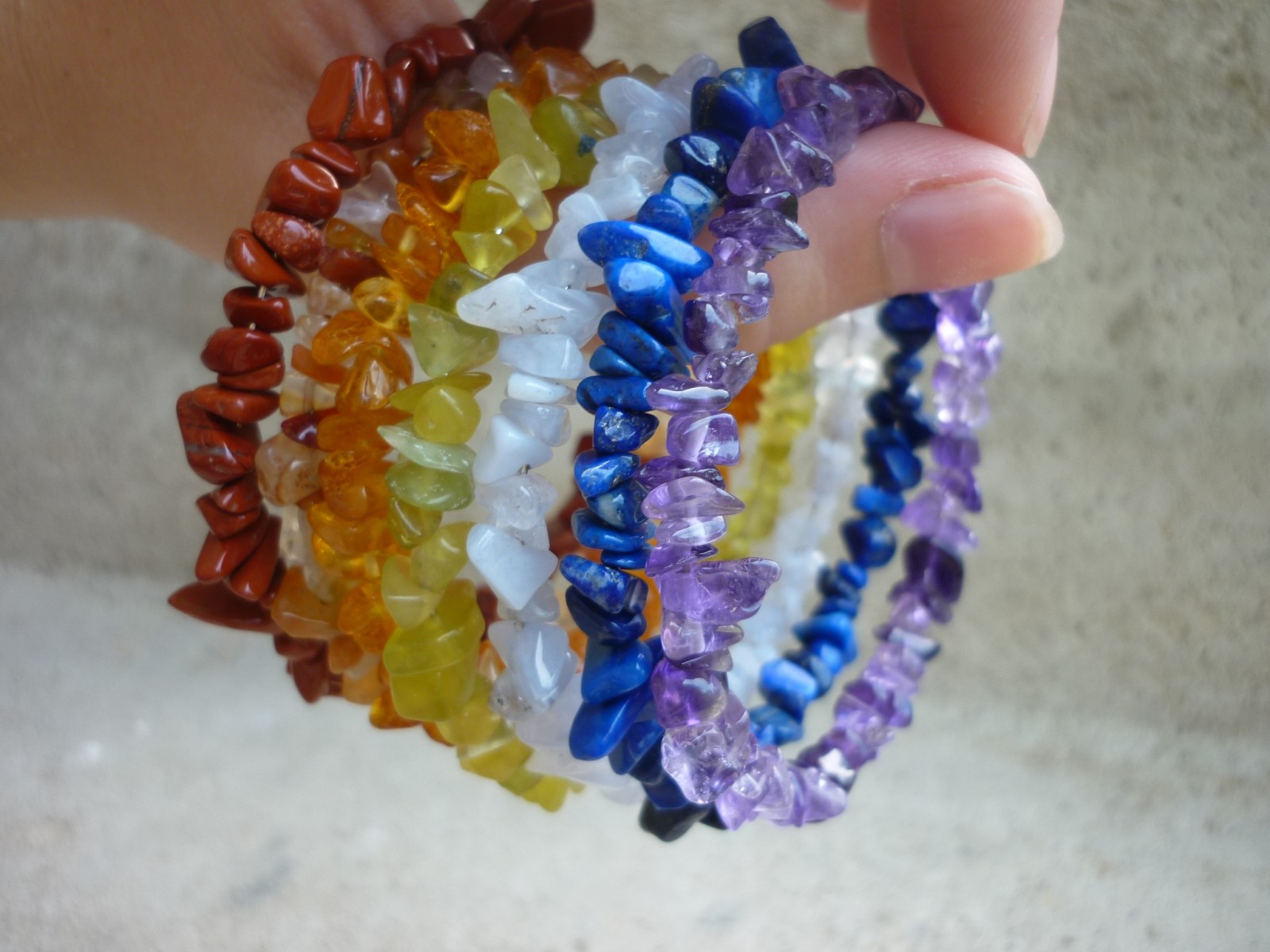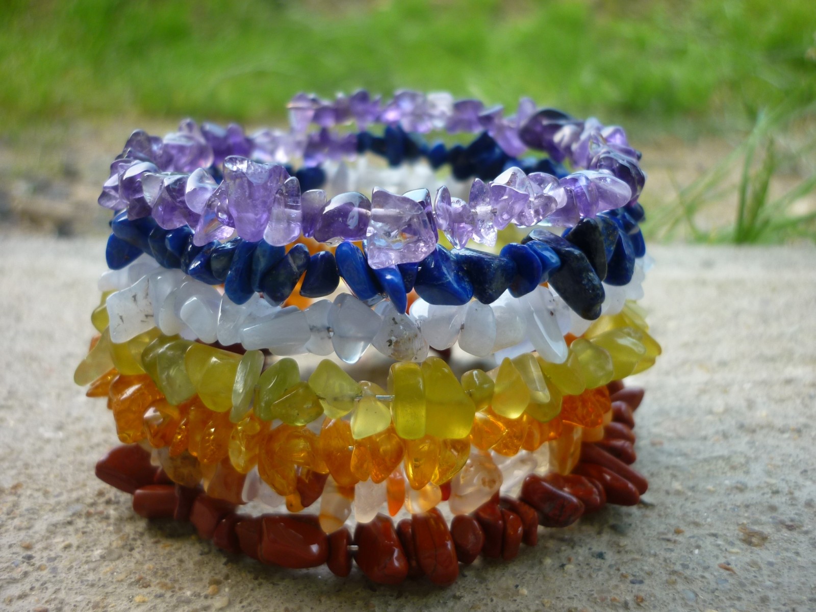 7 čaker - 7 minerálů. Harmonizující náramek návleknutý na paměťovém drátu o průměru 6 cm. Všechny uvedené minerály se vztahují k jednotlivým čakrám. Navléknuto v pořadí 1.-7. čakra : červený jaspis, karneol, jantar, jadeit, chalcedon, lapis lazuli, ametyst.