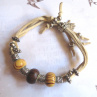 Atraktivní víceřadý náramek, vyrobený z kůže, kovových komponentů a korálků s velkým průvlekem, velikost univerzální - lze regulovat, maximum pro obvod ruky 19 cm.