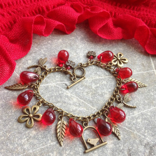 Náramek ve starobylém stylu - vintage v barvě mosazi s červenými plastovými kapkami a mosaznými přívěsky - ptáček v kleci, lístečky, květinky, motýlci, vážky - na hrubším řetízku. Délka 18 cm, OT zapínání. Délku můžu upravit na vámi požadovanou velikost