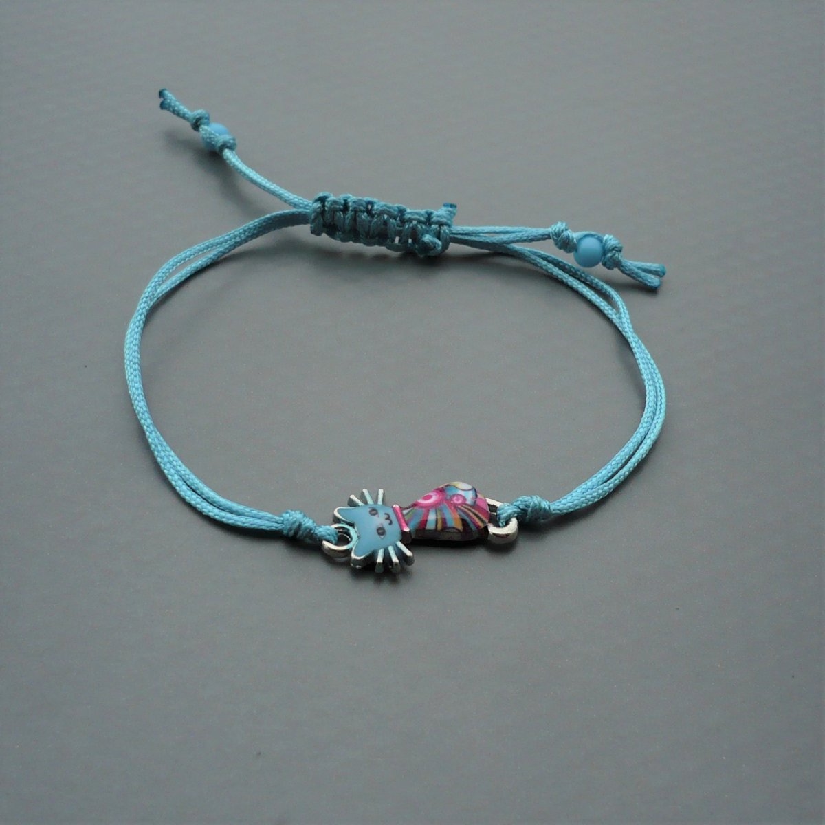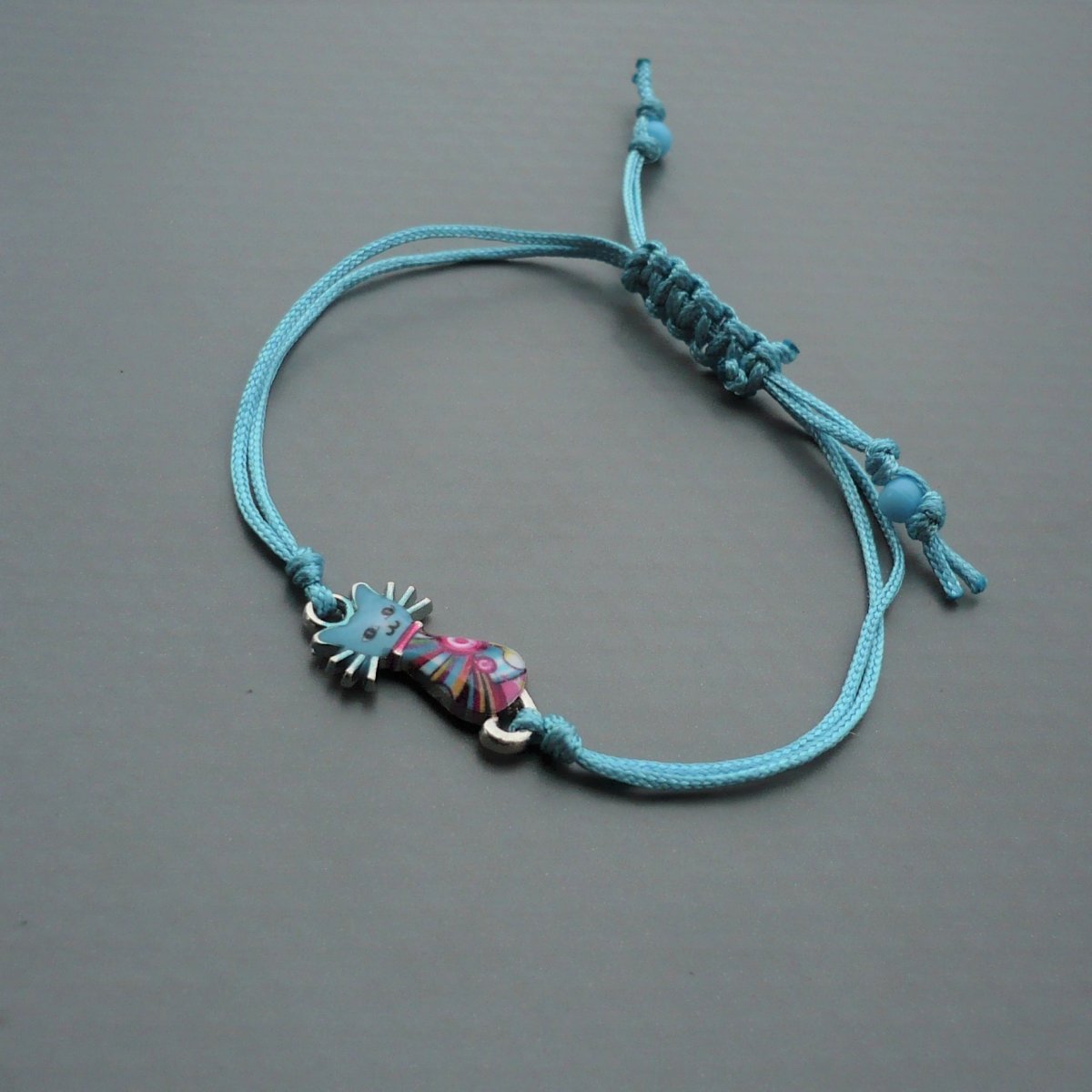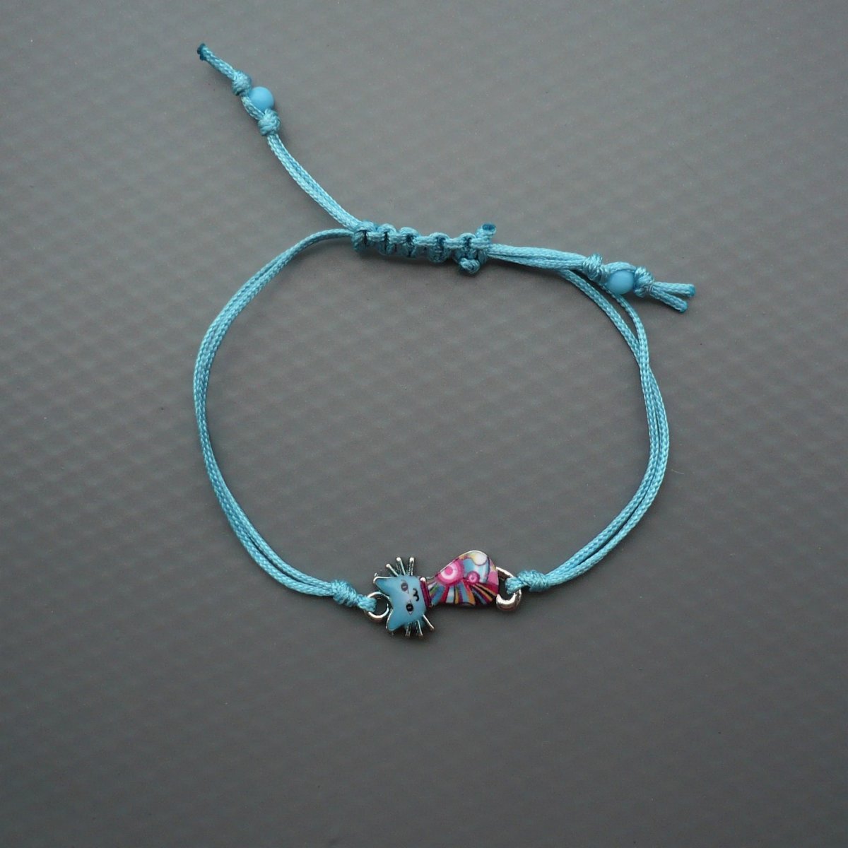 Oblíbený stahovací náramek na dvojité modré šňůrce se smaltovanou malou kočičkou.