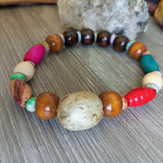 Náramek ze dřevěných korálků různých velikostí a barev , plochých barevných skleněných korálků a ozdobného semena Bodhi.
