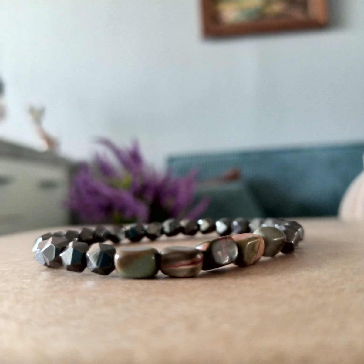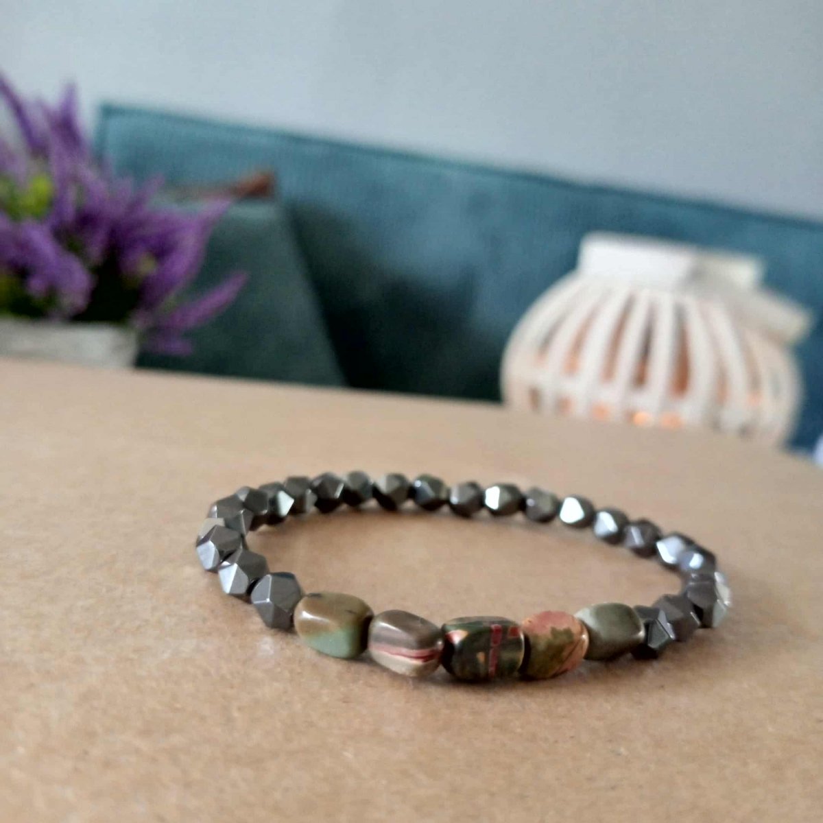 Náramek z korálků z fasetovaného hematitu cca 6mm , cihliček jaspisu picasso 5x7mm.
