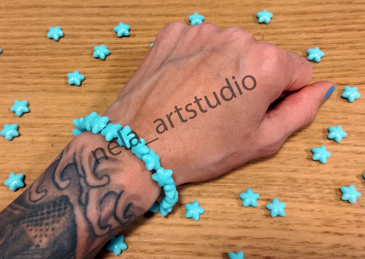 Akrylové korálky ve tvaru hvězdy 5 x 6 mm + elastická lycra 0,8 mm (pružný návlekový materiál), průvlak cca 1,8 mm.