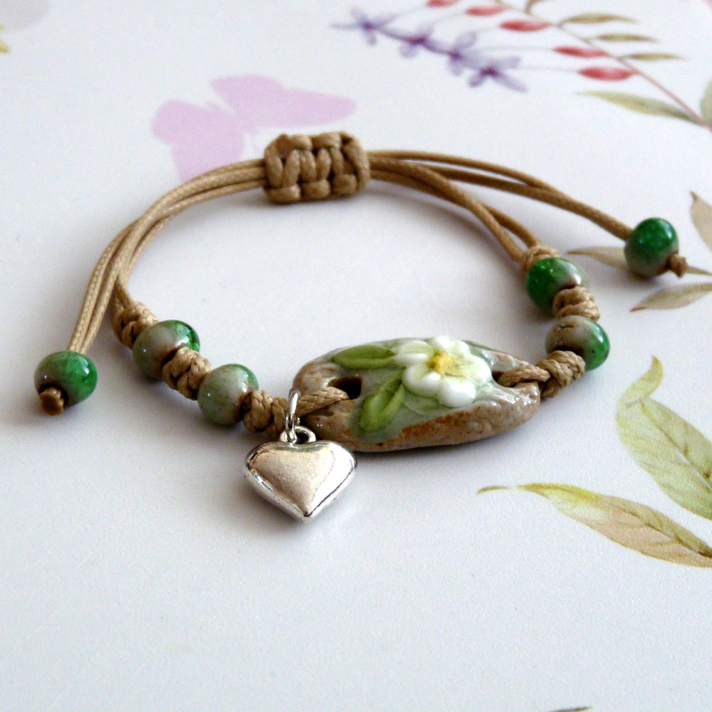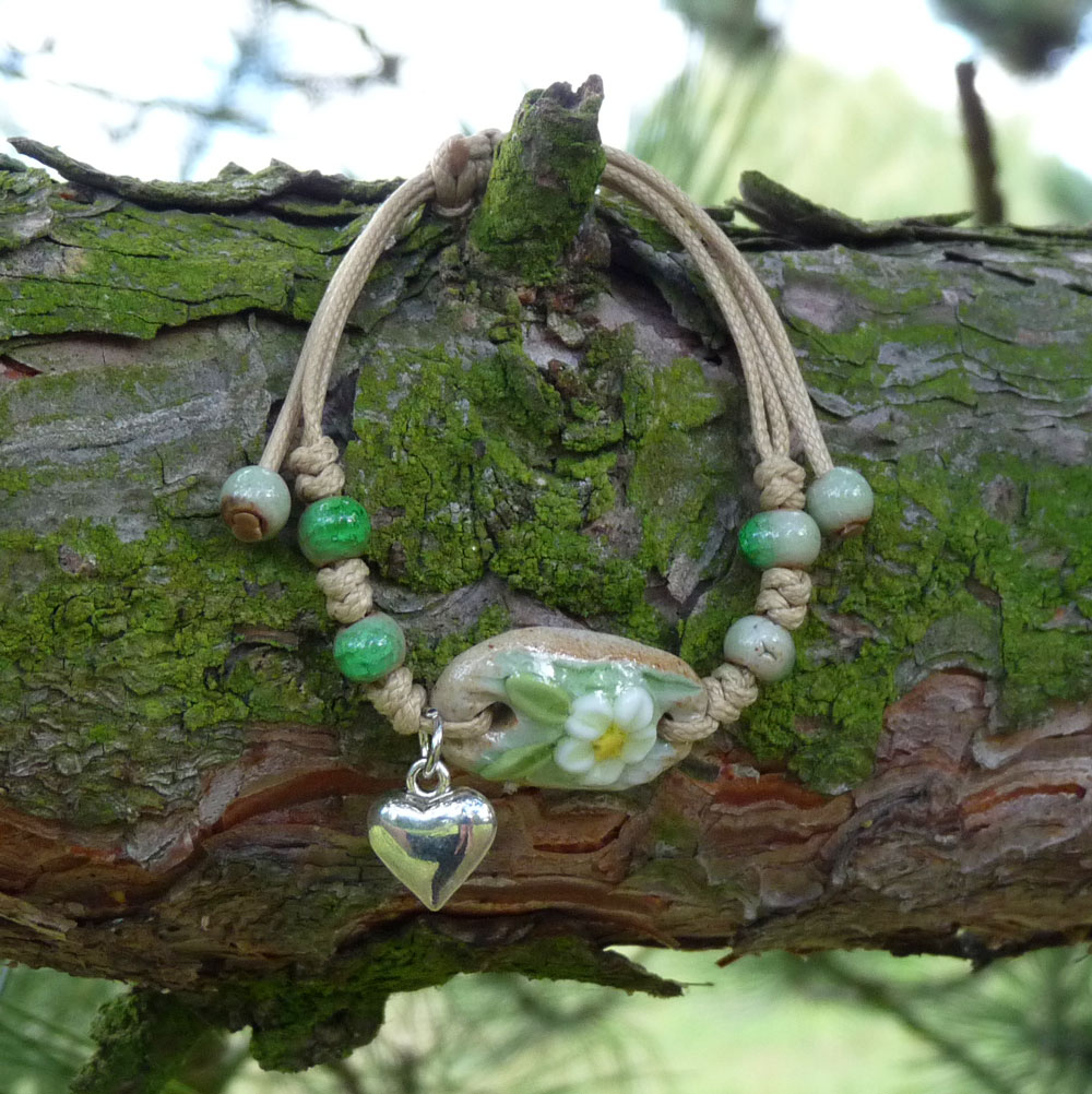 Je tvořený šňůrkami, na kterých je navlečený větší keramický korálek s bílým kvítkem ozdobený stříbrným srdíčkem.