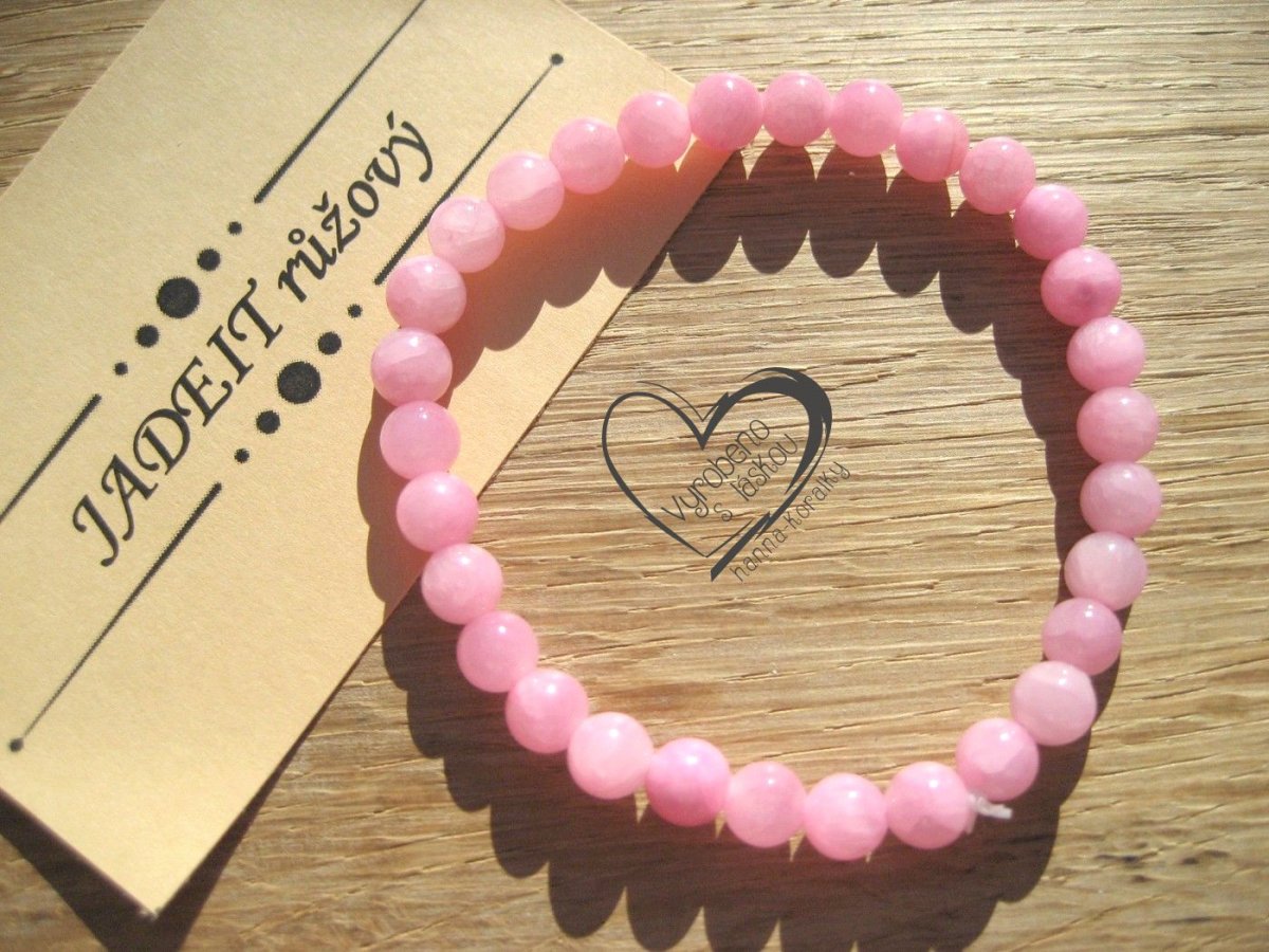 Náramek z minerálu Jadeit růžový, velikost korálků 6mm, obvod cca 18-18,5cm, kuličky jsou navlečeny na elastické gumičce - lycře, foto je ilustrační, protože každý náramek je originál, tudíž se může nepatrně lišit odstínem barvy či velikosti minerálních kuliček.