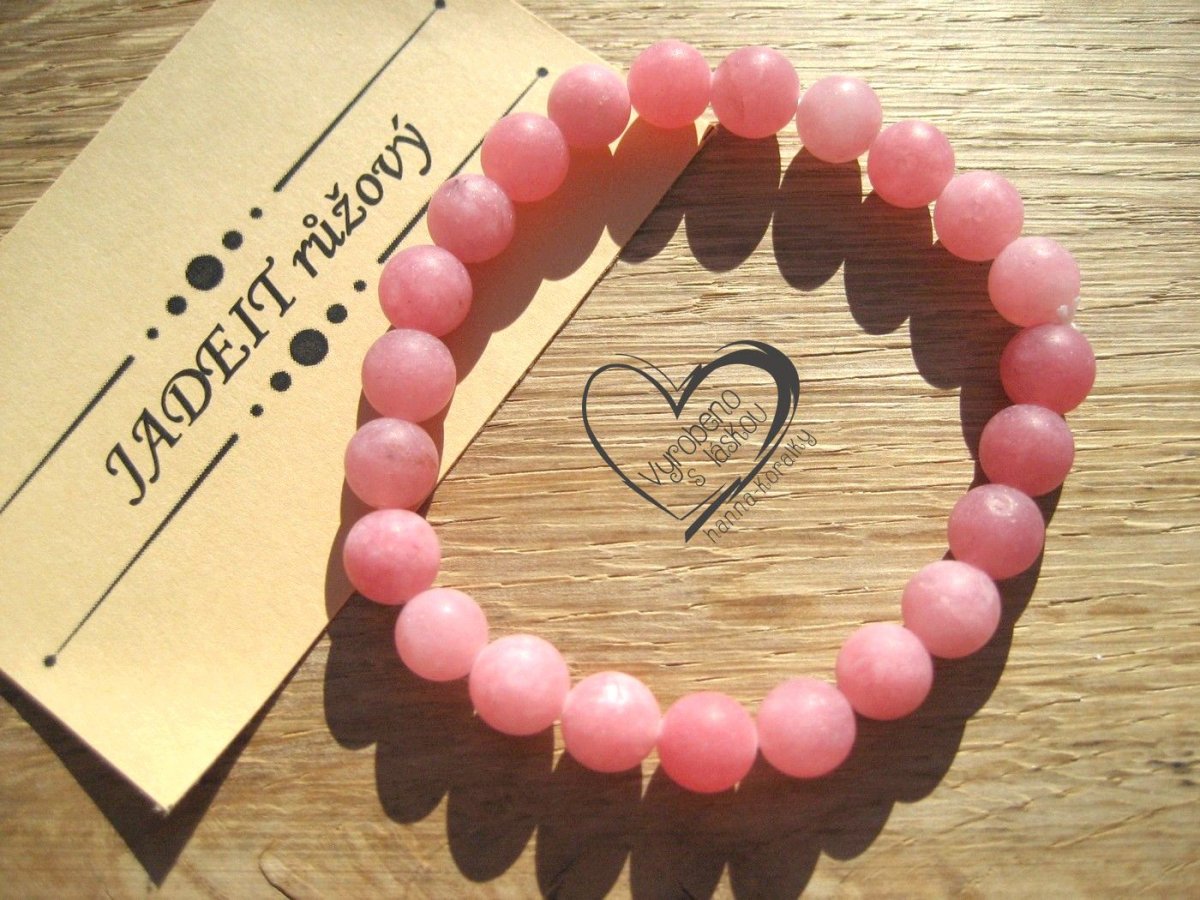 Náramek z minerálu Jadeit růžový matný, velikost korálků 8mm, obvod cca 18-18,5cm, kuličky jsou navlečeny na elastické gumičce - lycře, foto je ilustrační, protože každý náramek je originál, tudíž se může nepatrně lišit odstínem barvy či velikosti minerálních kuliček.