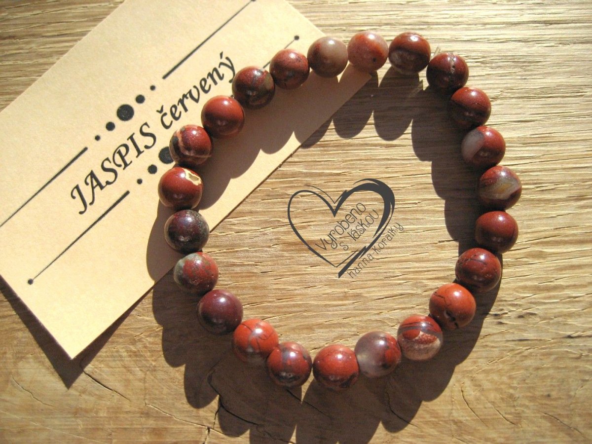 Náramek z minerálu Jaspis červený, vícebarevný, velikost korálků 8mm, obvod cca 18-18,5cm, kuličky jsou navlečeny na elastické gumičce - lycře, foto je ilustrační, protože každý náramek je originál, tudíž se může nepatrně lišit odstínem barvy či velikosti minerálních kuliček.