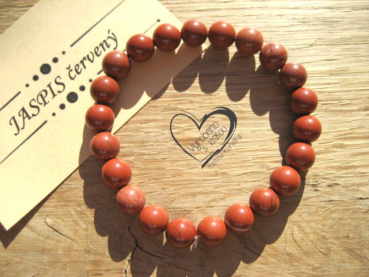 Náramek z minerálu Jaspis červený, velikost korálků 8mm, obvod cca 18-18,5cm, kuličky jsou navlečeny na elastické gumičce - lycře, foto je ilustrační, protože každý náramek je originál, tudíž se může nepatrně lišit odstínem barvy či velikosti minerálních kuliček.