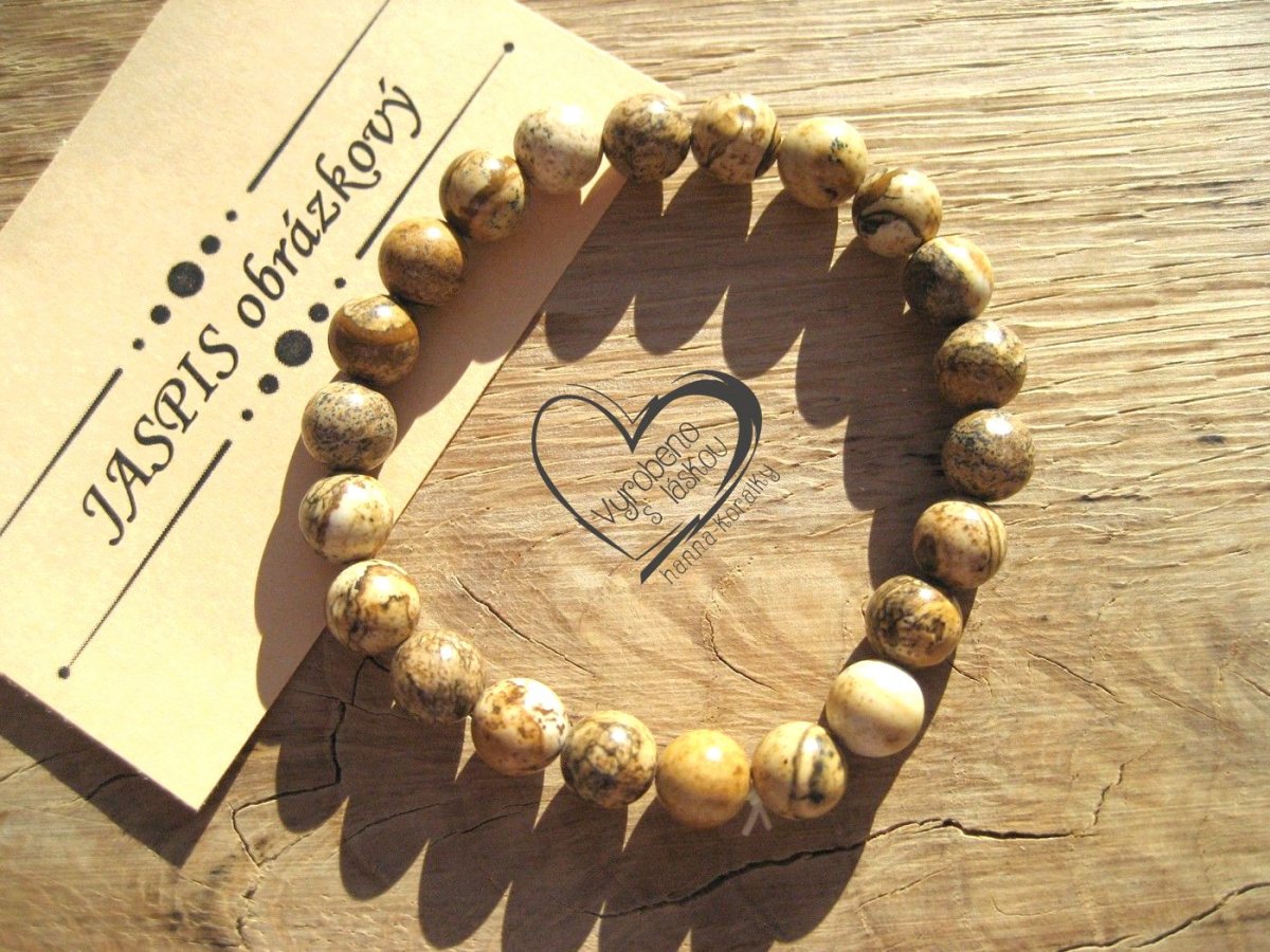 Náramek z minerálu Jaspis obrázkový, velikost korálků 8mm, obvod cca 18-18,5cm, kuličky jsou navlečeny na elastické gumičce - lycře, foto je ilustrační, protože každý náramek je originál, tudíž se může nepatrně lišit odstínem barvy či velikosti minerálních kuliček.