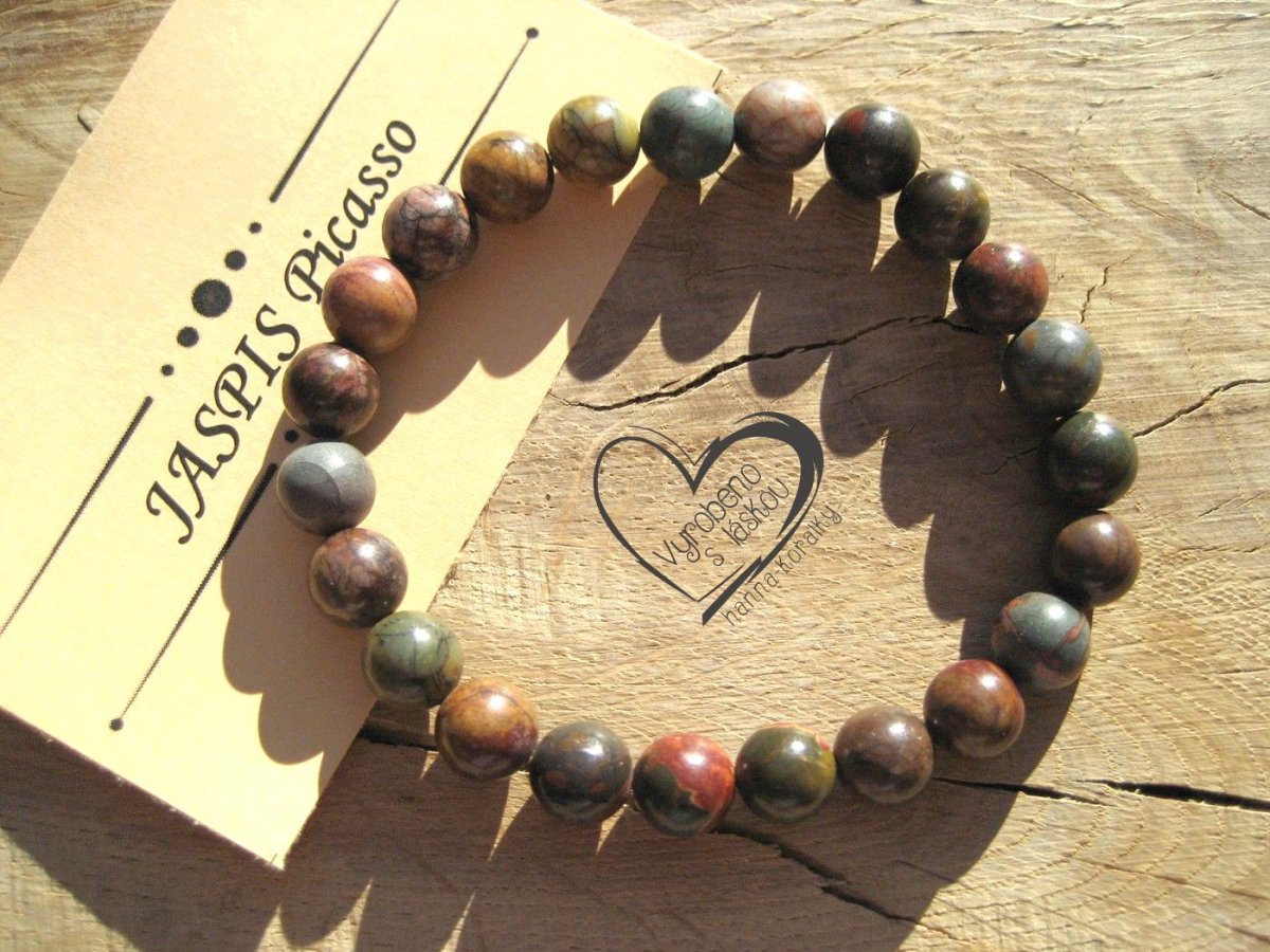 Náramek z minerálu Jaspis Picasso, velikost korálků 8mm, obvod cca 18-18,5cm, kuličky jsou navlečeny na elastické gumičce - lycře, foto je ilustrační, protože každý náramek je originál, tudíž se může nepatrně lišit odstínem barvy či velikosti minerálních kuliček