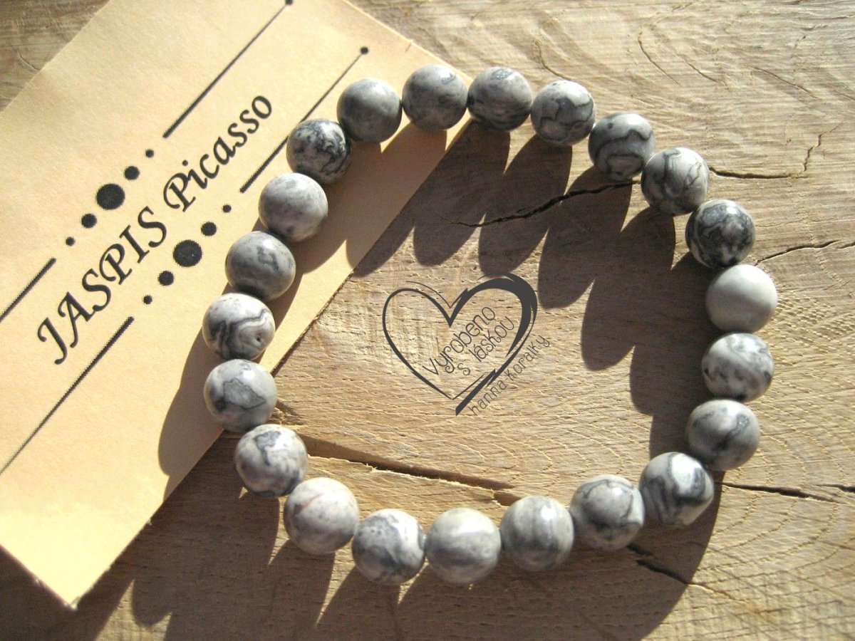 Náramek z minerálu Jaspis Picasso, velikost korálků 8mm, obvod cca 18-18,5cm, kuličky jsou navlečeny na elastické gumičce - lycře, foto je ilustrační, protože každý náramek je originál, tudíž se může nepatrně lišit odstínem barvy či velikosti minerálních kuliček