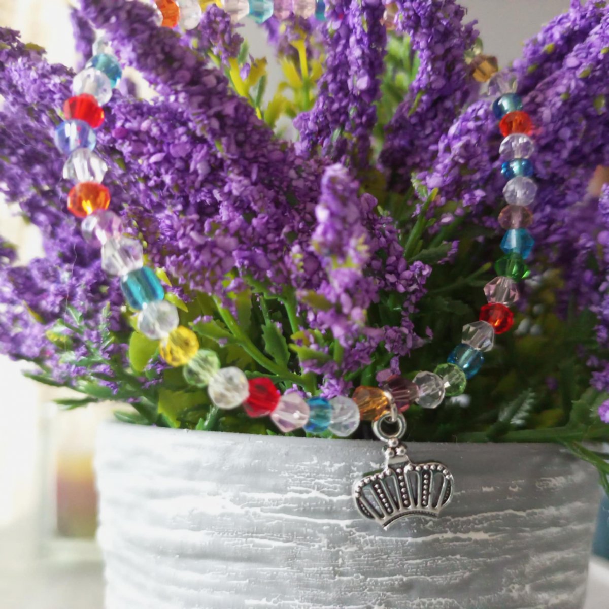 Náramek ze skleněných broušených korálků a přívěšku ze slitiny zinku.