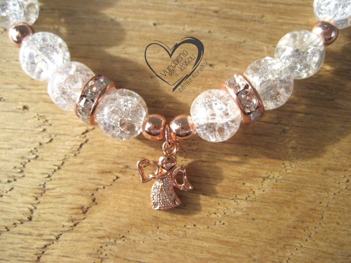 Náramek z minerálu Křišťál, Hematit, kovových rondelek a andělíčka z mosazi s kubickými zirkony v barvě rose gold, velikost korálků 8mm a 6mm, obvod cca 18cm, kuličky jsou navlečeny na elastické gumičce - lycře, každý náramek je originál, tudíž se může nepatrně lišit odstínem barvy či velikosti minerálních kuliček. Pokud potřebujete větší obvod - stačí napsat a ráda upravím.