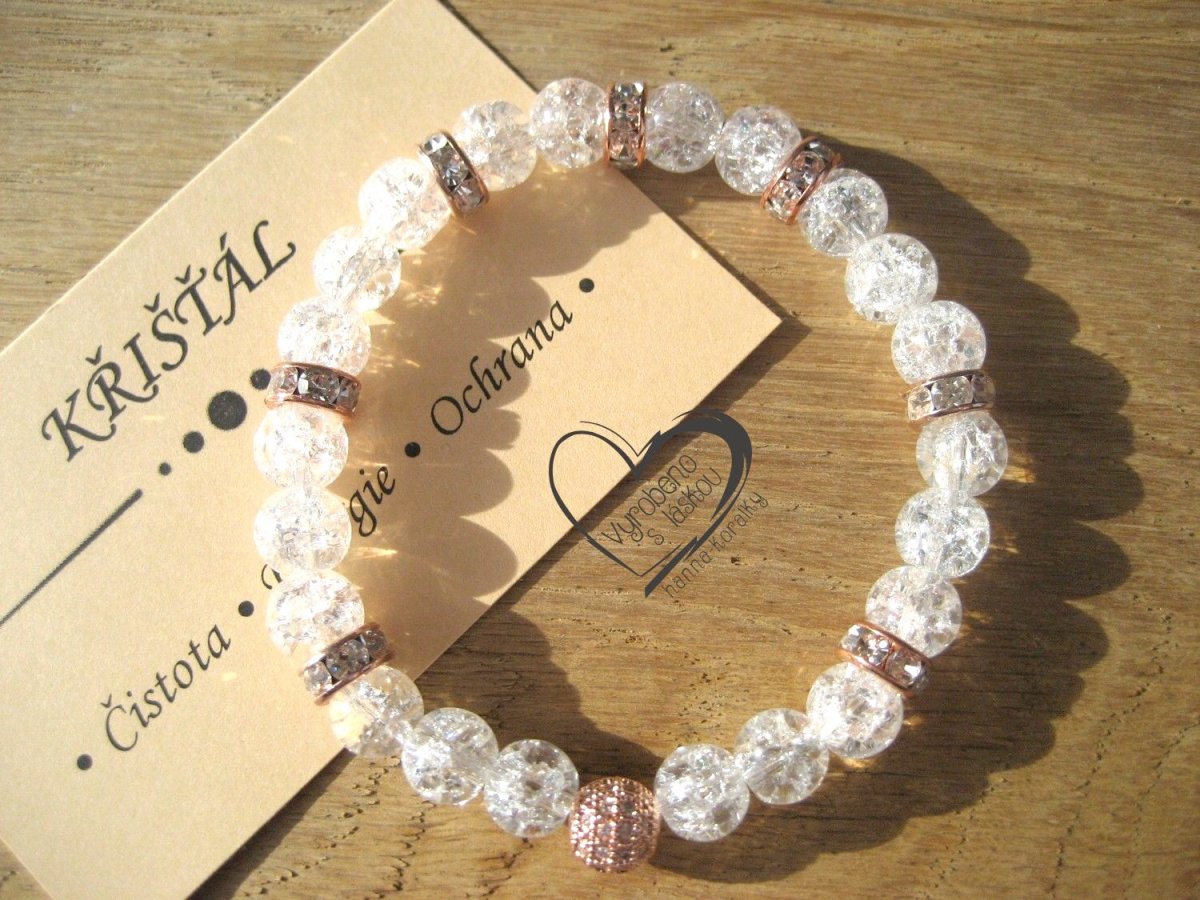 Náramek z minerálu Křišťál, kovových rondelek a mosazné kuličky s kubickými zirkony v barvě rose gold, velikost korálků 8mm, obvod cca 18cm, kuličky jsou navlečeny na elastické gumičce - lycře, každý náramek je originál, tudíž se může nepatrně lišit odstínem barvy či velikosti minerálních kuliček. Pokud potřebujete větší obvod - stačí napsat a ráda upravím.