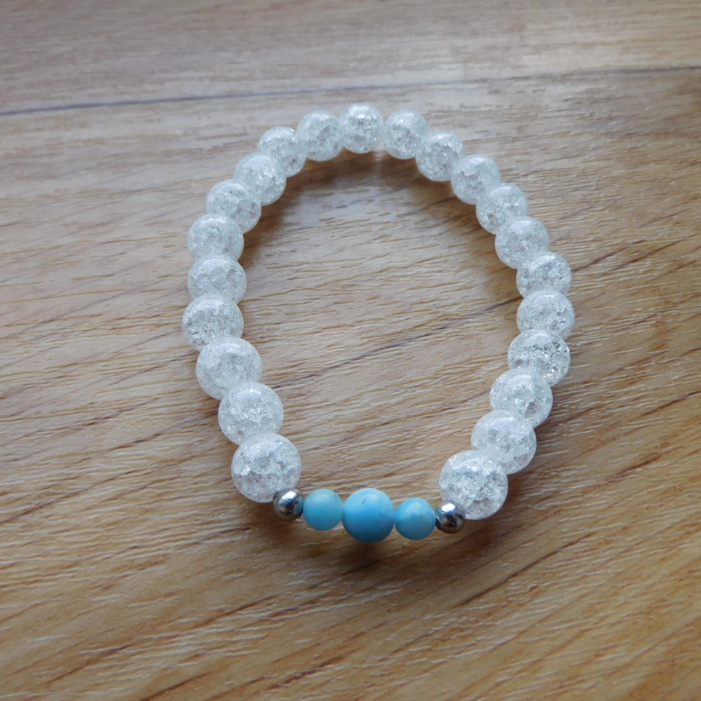 Jednoduchý jemný náramek z krásného práskaného křišťálu a třech kuliček larimaru, nerezu.