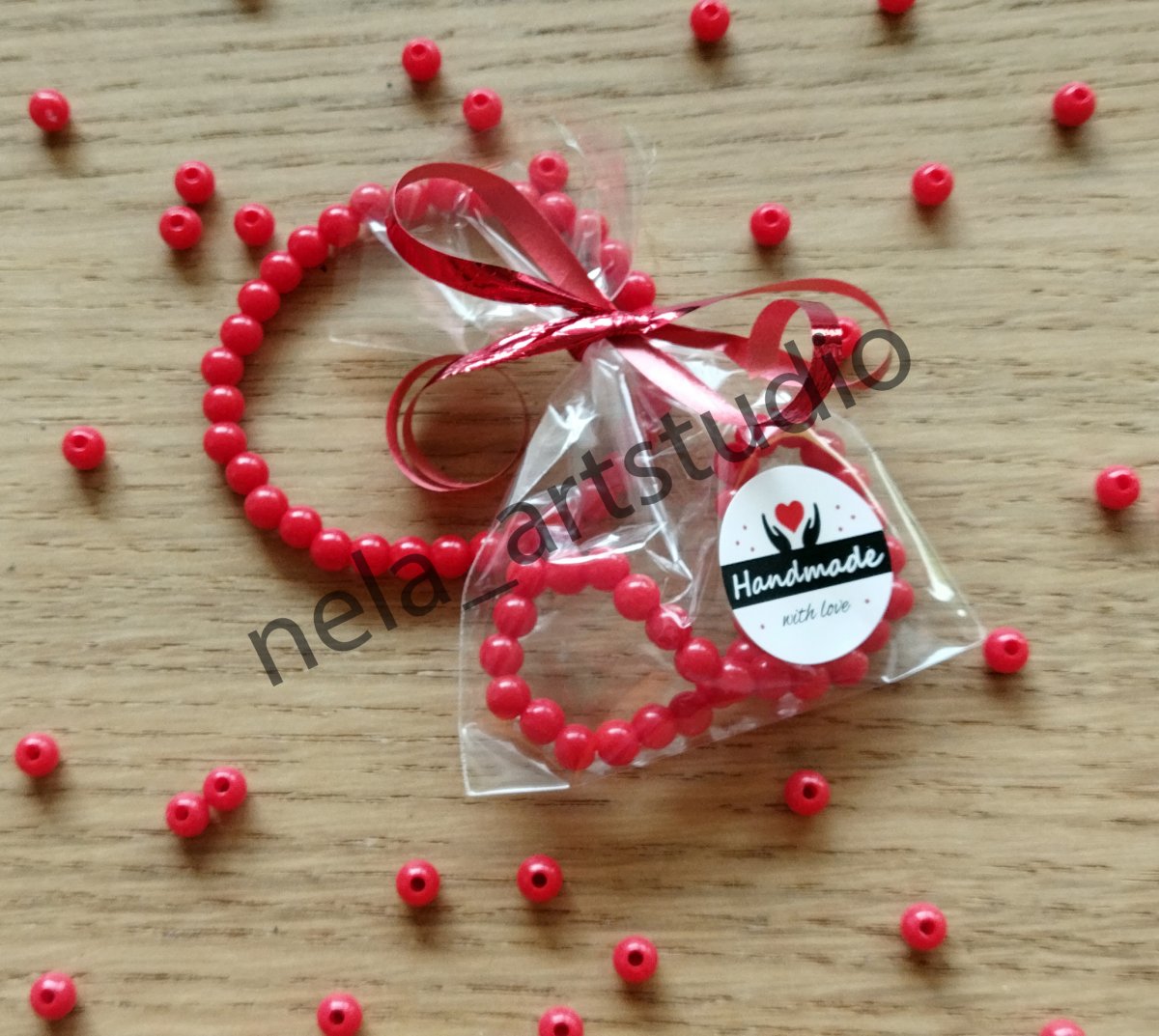 Náramek z korálků ve tvaru kuličky.Akrylové korálky ve tvaru kuličky 5 x 6 mm + elastická lycra 0,8 mm (pružný návlekový materiál), průvlak cca 1,8 mm.Rozměry náramku: cca 17 cm (33 korálků). Zabaleno v celofánovém sáčku.