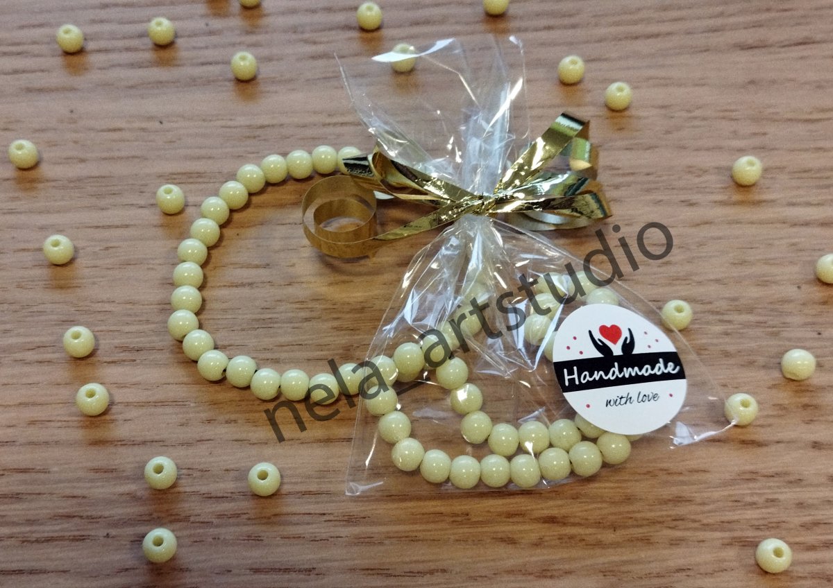 Náramek z korálků ve tvaru kuličky.Akrylové korálky ve tvaru kuličky 5 x 6 mm + elastická lycra 0,8 mm (pružný návlekový materiál), průvlak cca 1,8 mm.Rozměry náramku: cca 17 cm (33 korálků). Zabaleno v celofánovém sáčku.