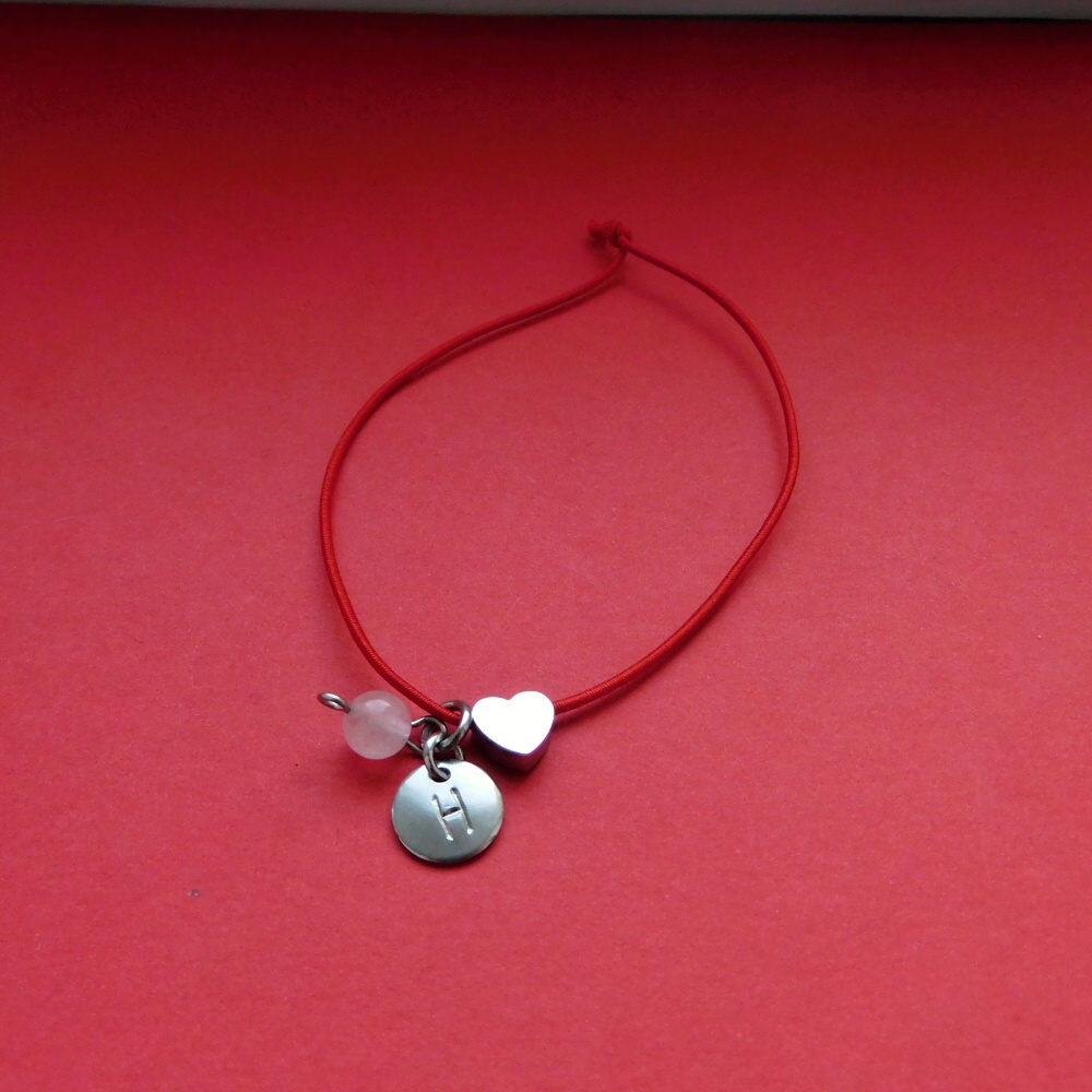 Krásný náramek, symbolizuje lásku, víru, naději....... Navlečeno jedno písmenko, růženinový kámen a větší nerezové srdíčko.