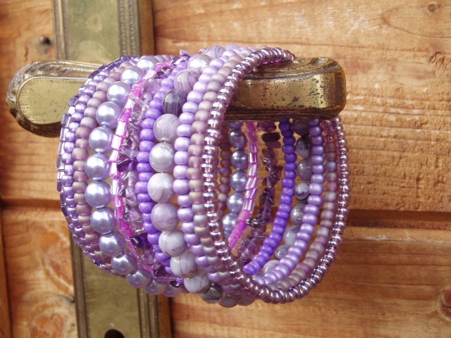 Náramek z tromlovaného léčivého minerálu ametystu navléknutého na otočkovém paměťovém drátu. Doplněno perličkami, skleněnými a rokajlovými korálky.