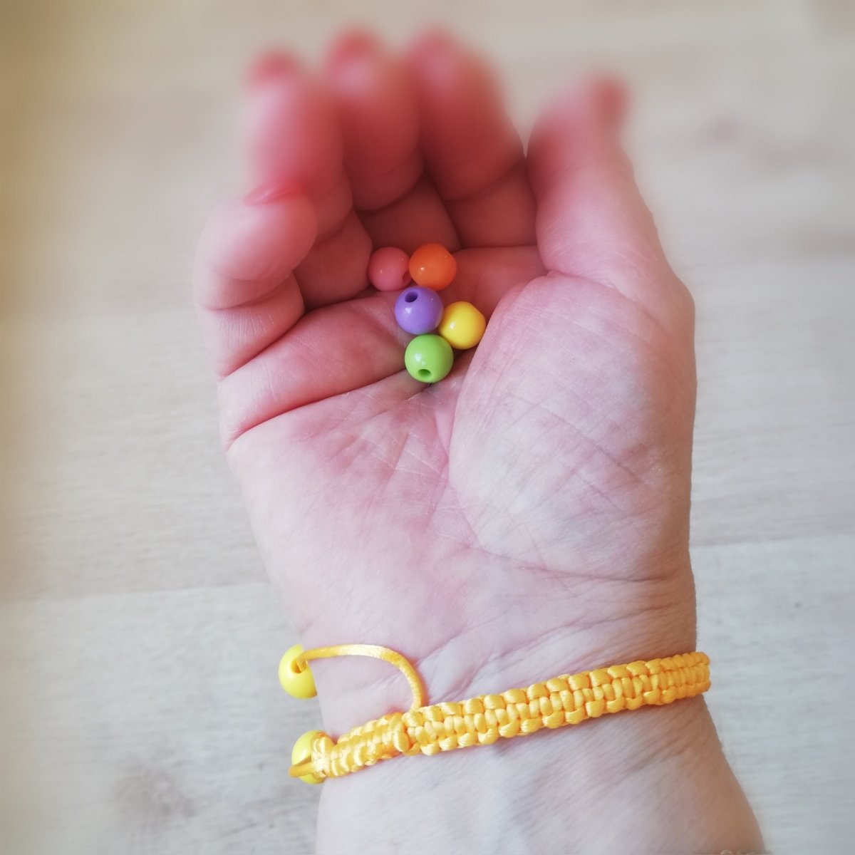 Náramek je vyplétaný technikou macramé ze saténové žluté šňůrky a plastových pastelových korálků. Zapínání na posuvný uzlík.