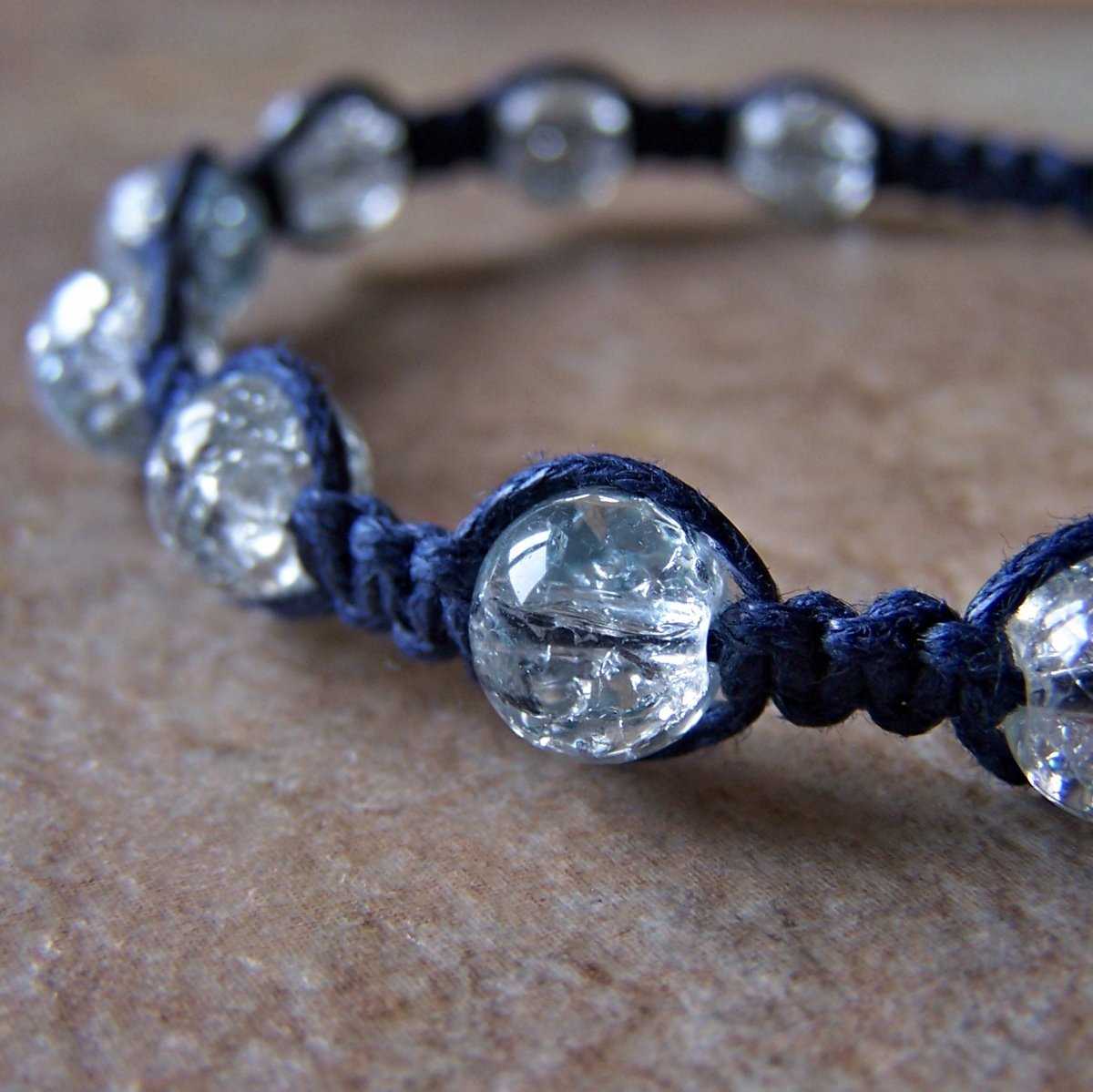 Náramek je vyroben z tmavě modré bavlněné voskové šňůrky technikou macramé (uzlíková technika). Je doplněn o skleněné korálky práskačky(o velikosti cca 8 mm), které jsou zdobené stříbrnými stříkanci.