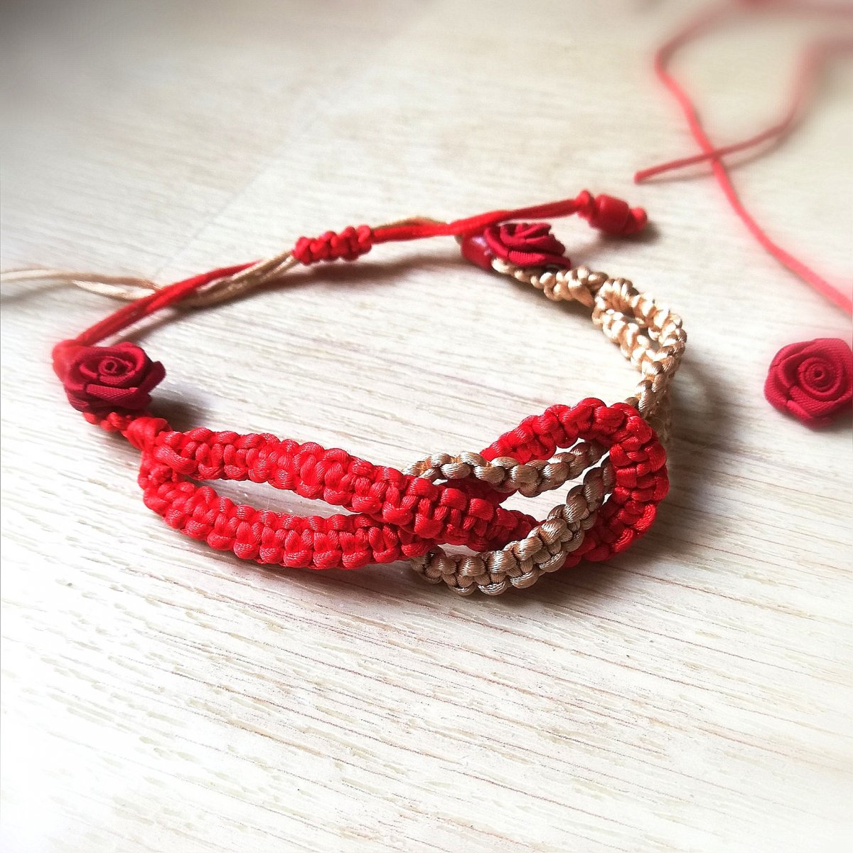 Náramek je vyplétaný technikou macramé ze saténové červené a béžové šňůrky. Je doplněný saténovými červenými růžičkami.