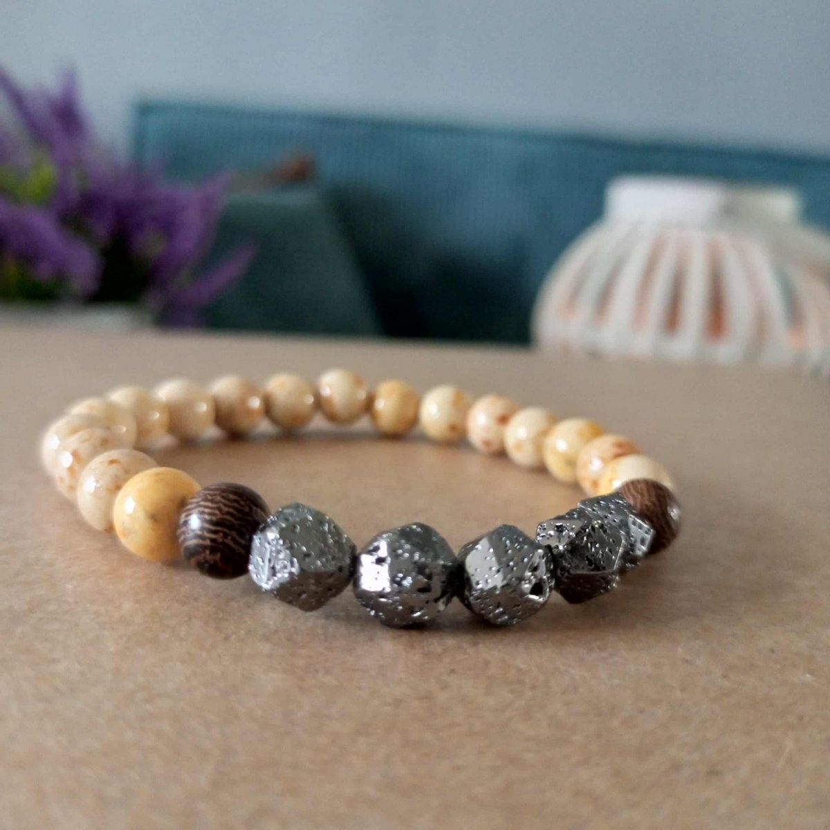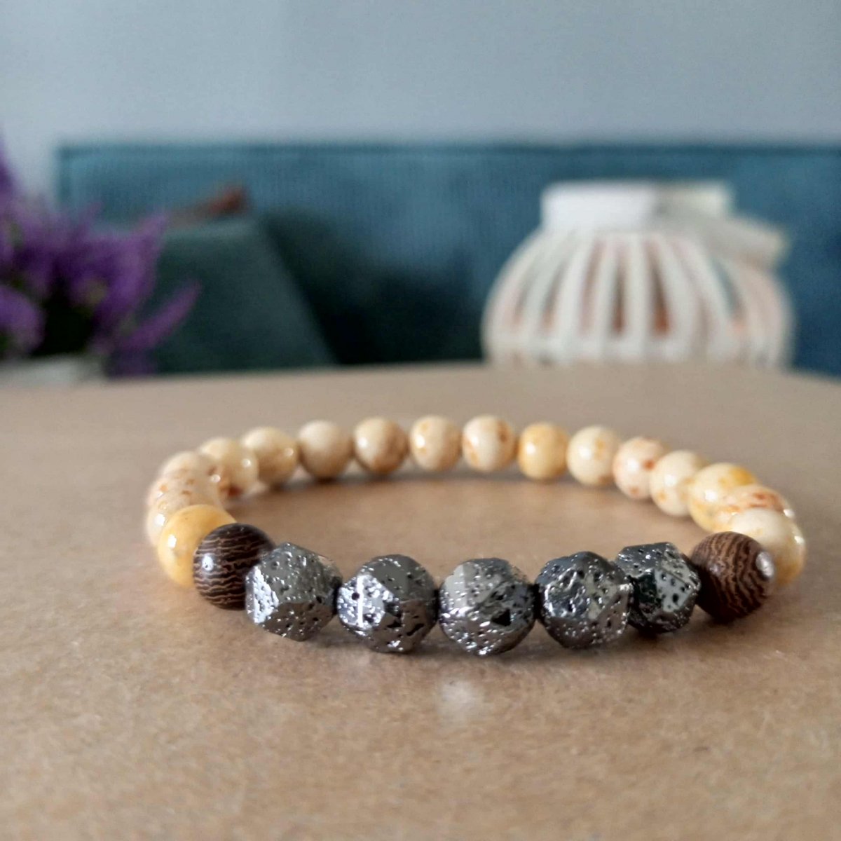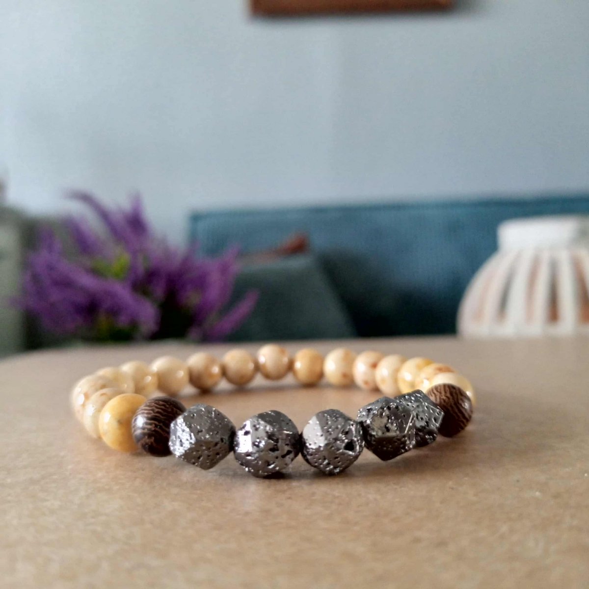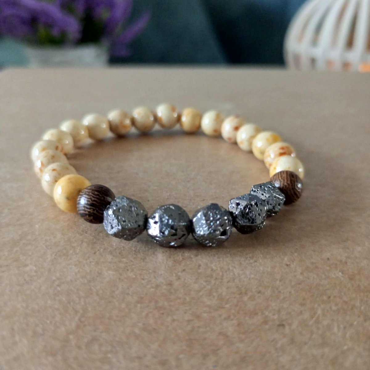Náramek z magnezitu , dřevěných korálek 8mm , doplněný fasetovaným pyritem