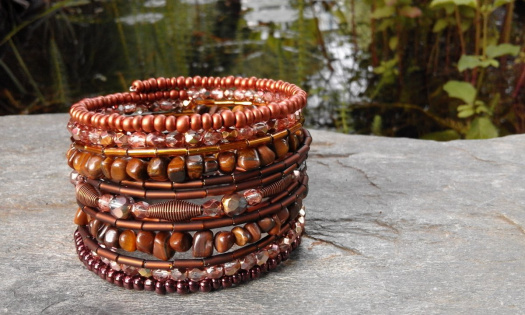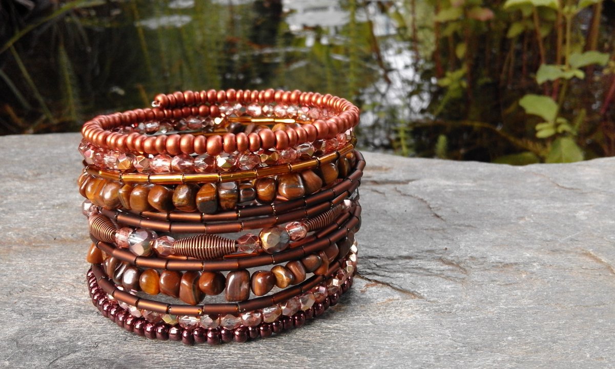 Náramek na paměťovém drátku o průměru 6cm. K výrobě byly použity skleněné korálky, rokajl,ohňovky,kovové mezidílky" a minerál tygří oko. Navléká se jemným omotáváním okolo zápěstí.