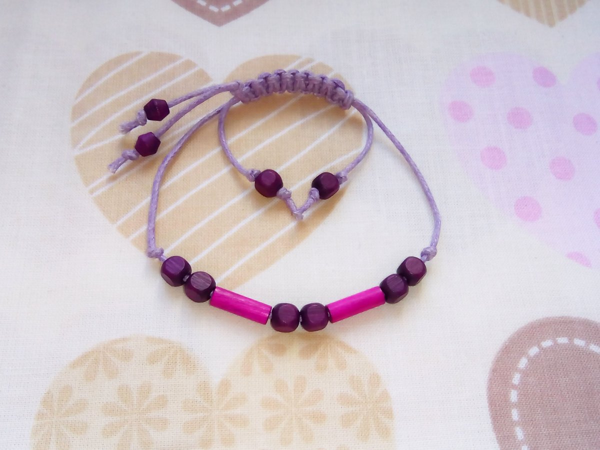 Nastavitelná velikost, zatahovací. Vyrobeno z textilní šňůrky s dřevěnými korálky.