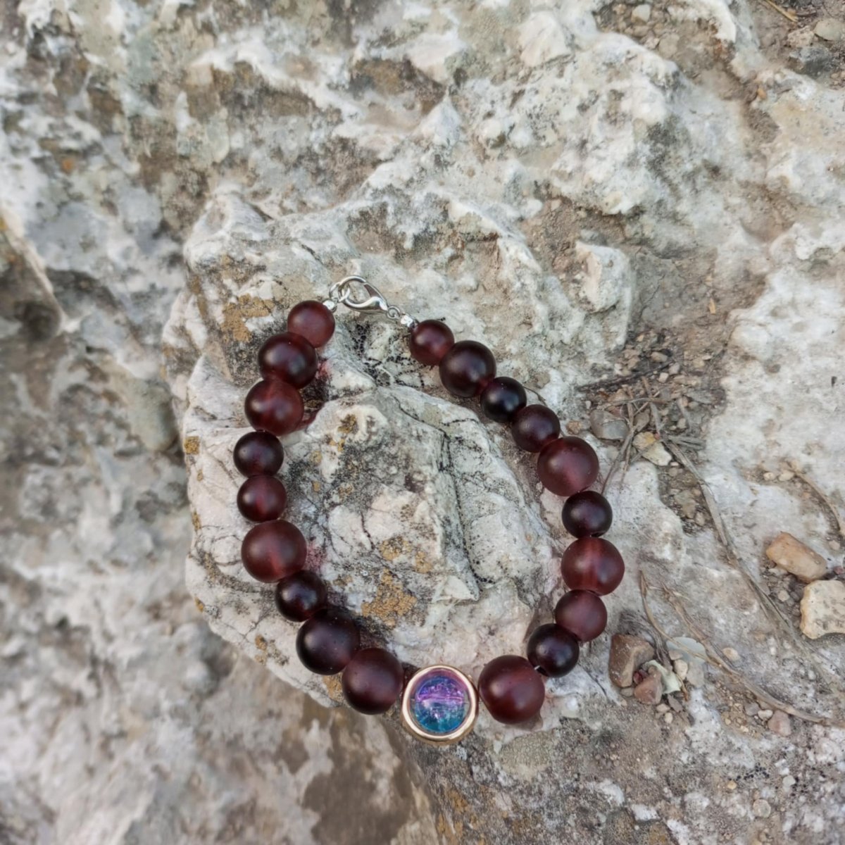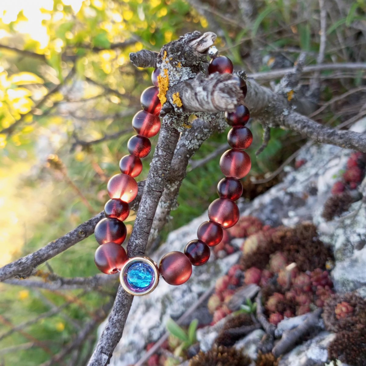 Hnědé skleněné korálky s ozdobným modrým praskaným korálkem.