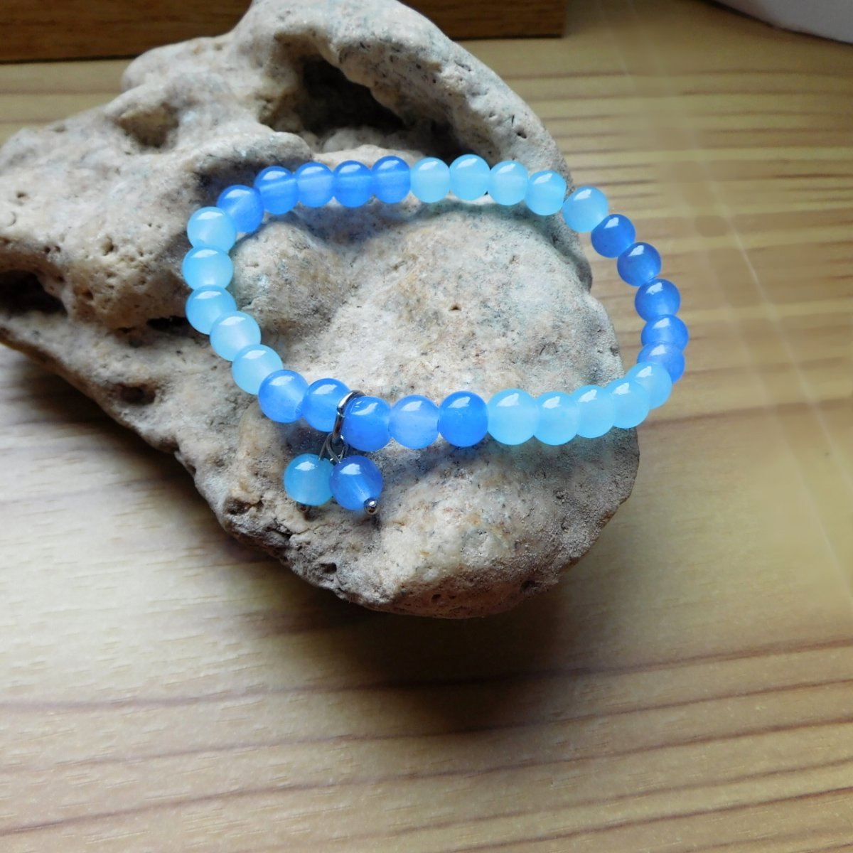 Náramek je vyrobený z malých modrých jadeitů, ..... a nerezu......