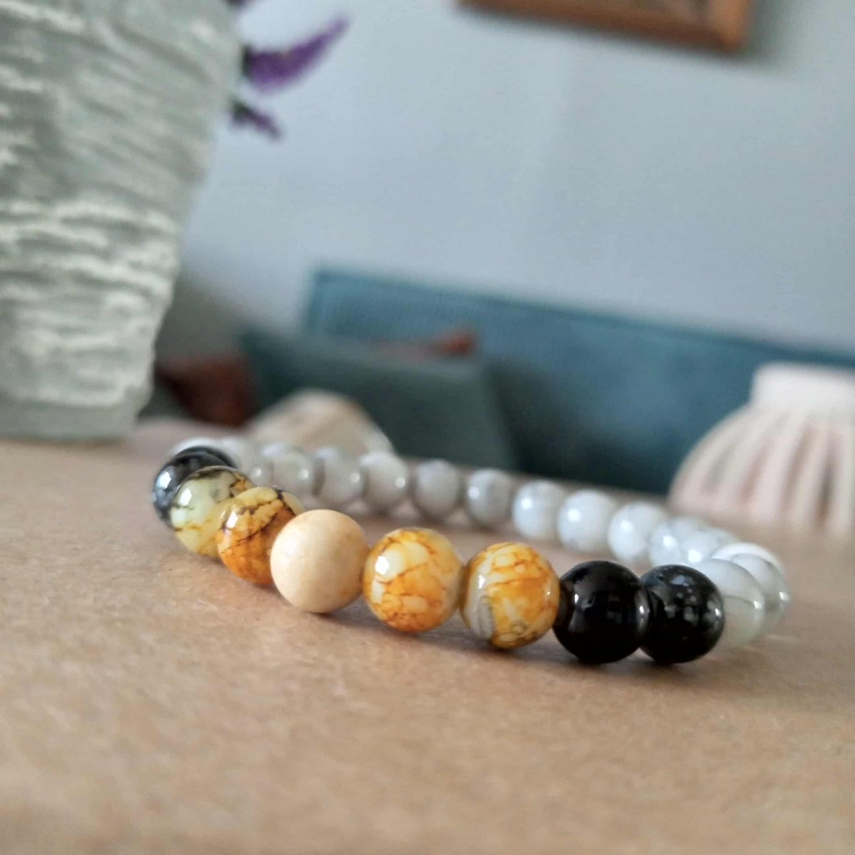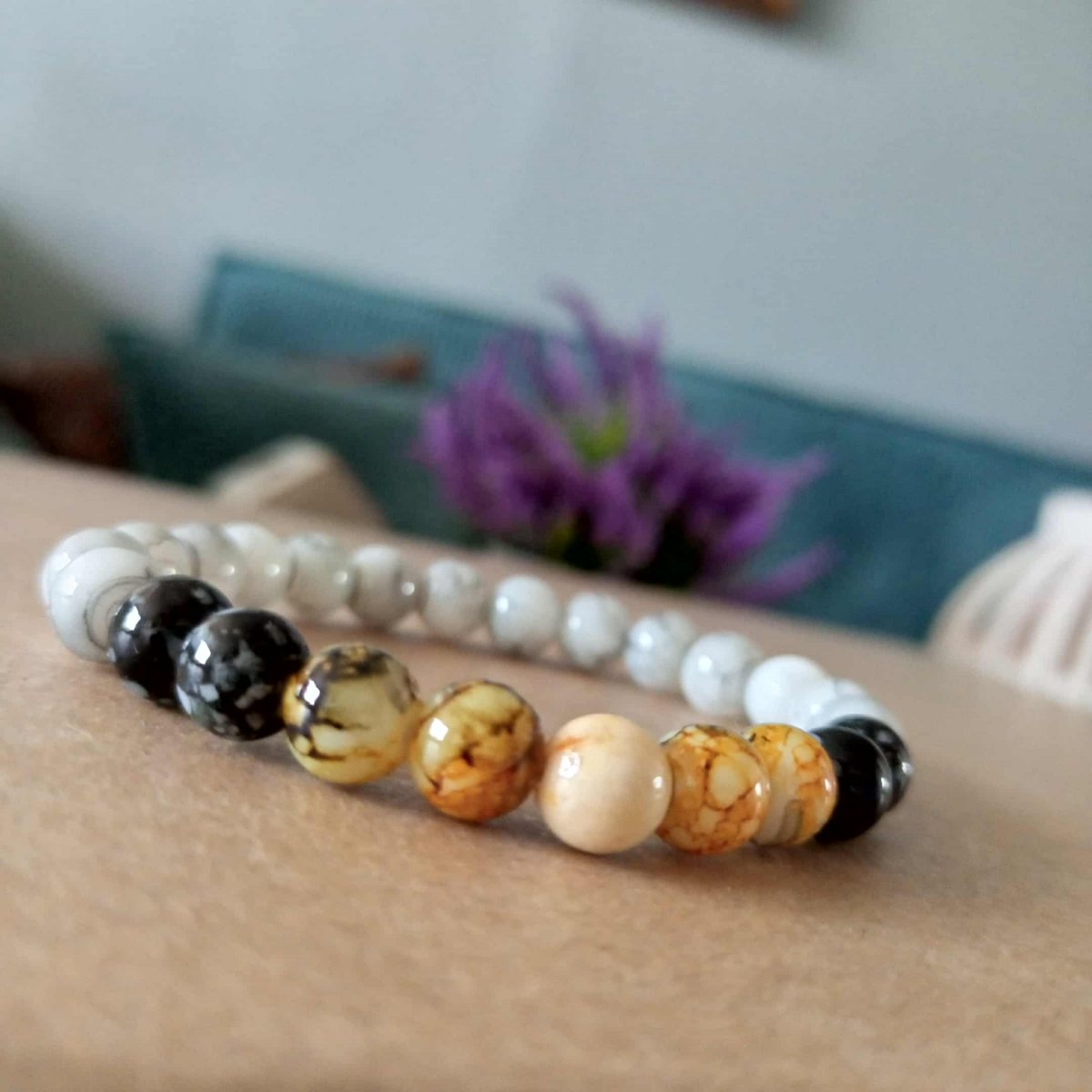 Náramek ze skleněných korálek 8mm , doplněný jedním korálkem magnezitu.