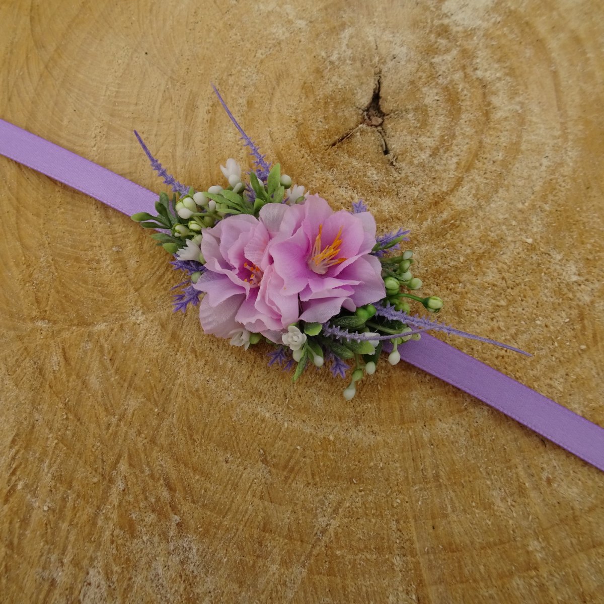 Náramek na ruku v růžových, fialových a bílých odstínech. Náramek je tvořen z látkových a umělých květin, umělé zeleně, bobulek a světle fialové atlasové stuhy. Na ruku se zavazuje stuhou.