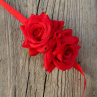 Náramek na ruku s růžemi v červené barvě. Náramek je tvořen z látkových růží a červené atlasové stuhy. Na ruku se zavazuje stuhou.