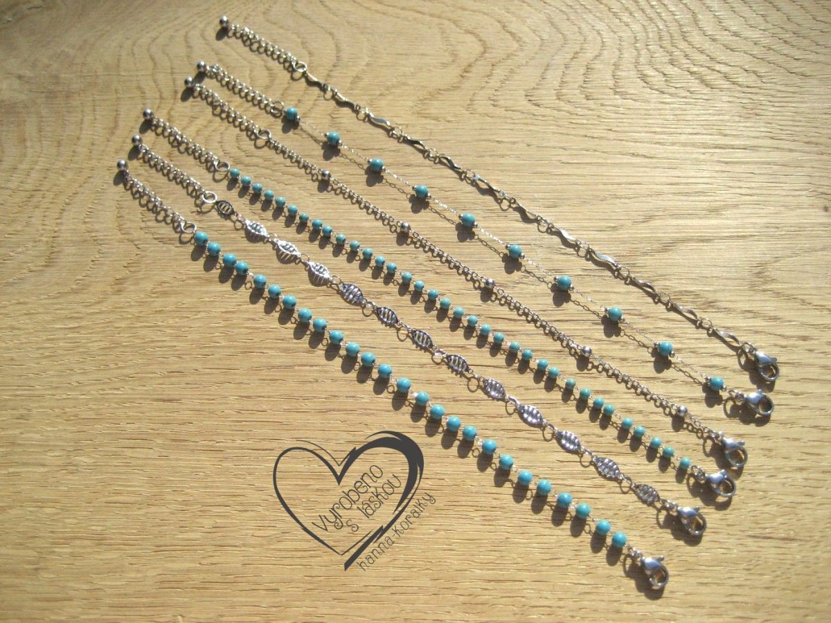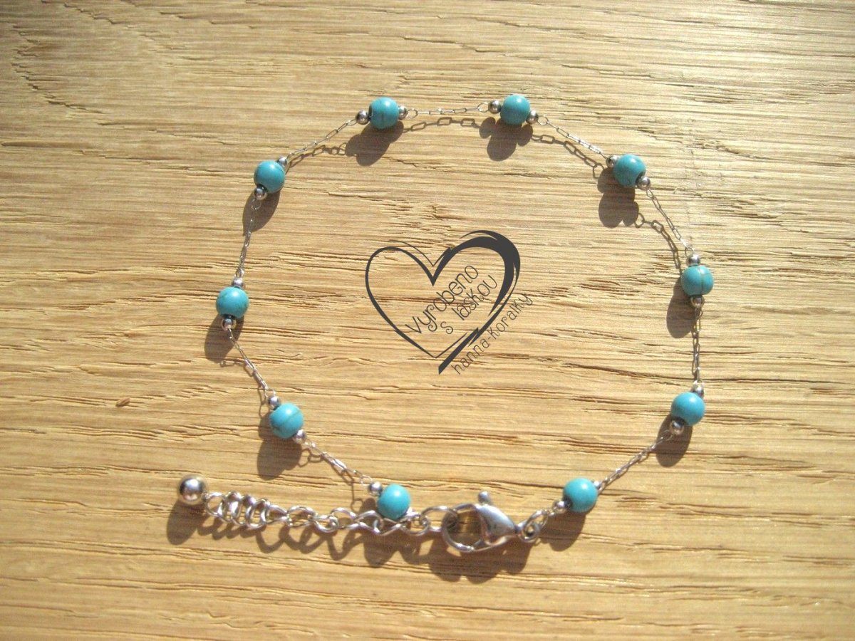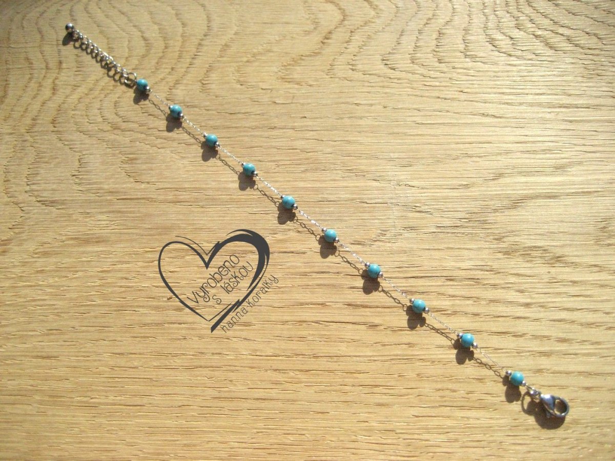 Jemný náramek z nerezové oceli s minerálem tyrkenit, šperk pro každou příležitost, velikost korálků 4mm a délka 19 + 3 cm prodlužovací řetízek zakončený ozdobnou kuličkou.