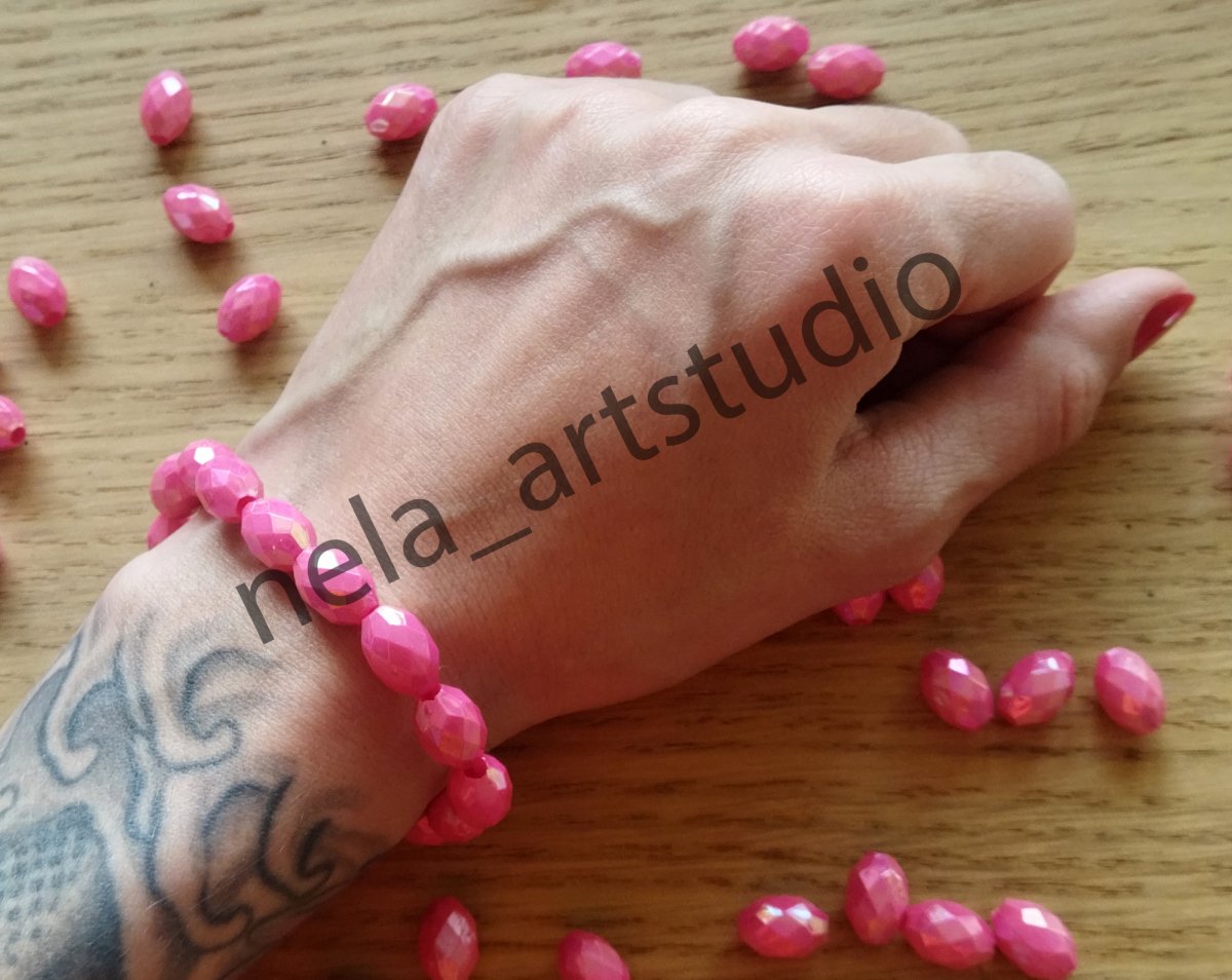 Náramek z korálků ve tvaru oválu.Akrylové, fasetované korálky s leskem ve tvaru oválu 12x8mm + elastická lycra 0,8mm (pružný návlekový materiál), průvlak cca 1,8mm.Rozměry náramku: cca 17,5cm (15 korálků). Zabaleno v celofánovém sáčku.