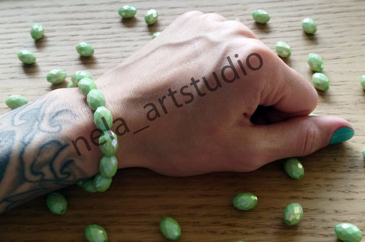 Akrylové, fasetované korálky s leskem ve tvaru oválu 12x8mm + elastická lycra 0,8mm (pružný návlekový materiál), průvlak cca 1,8mm.