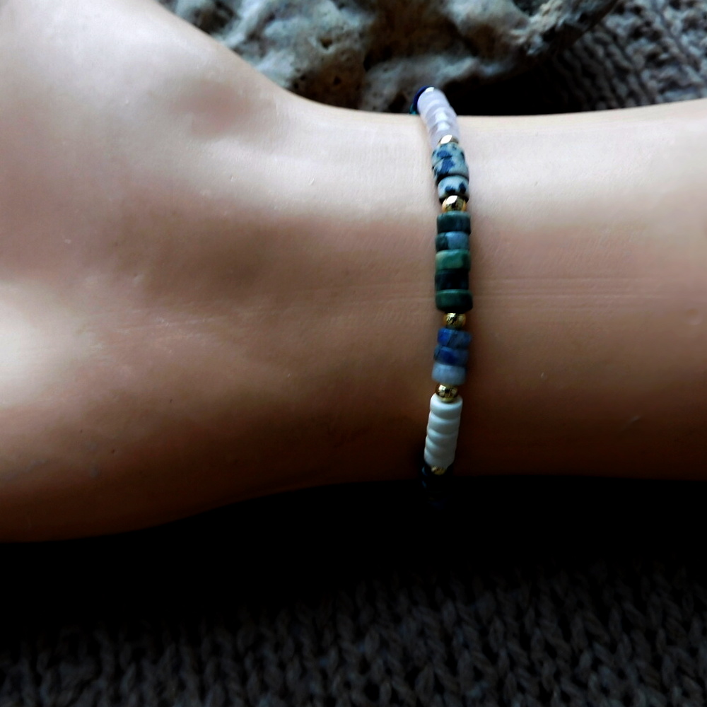 Pěkný jednoduchý náramek vyrobený z několika druhů polodrahokamů, nerez pozlacenými kuličkami....