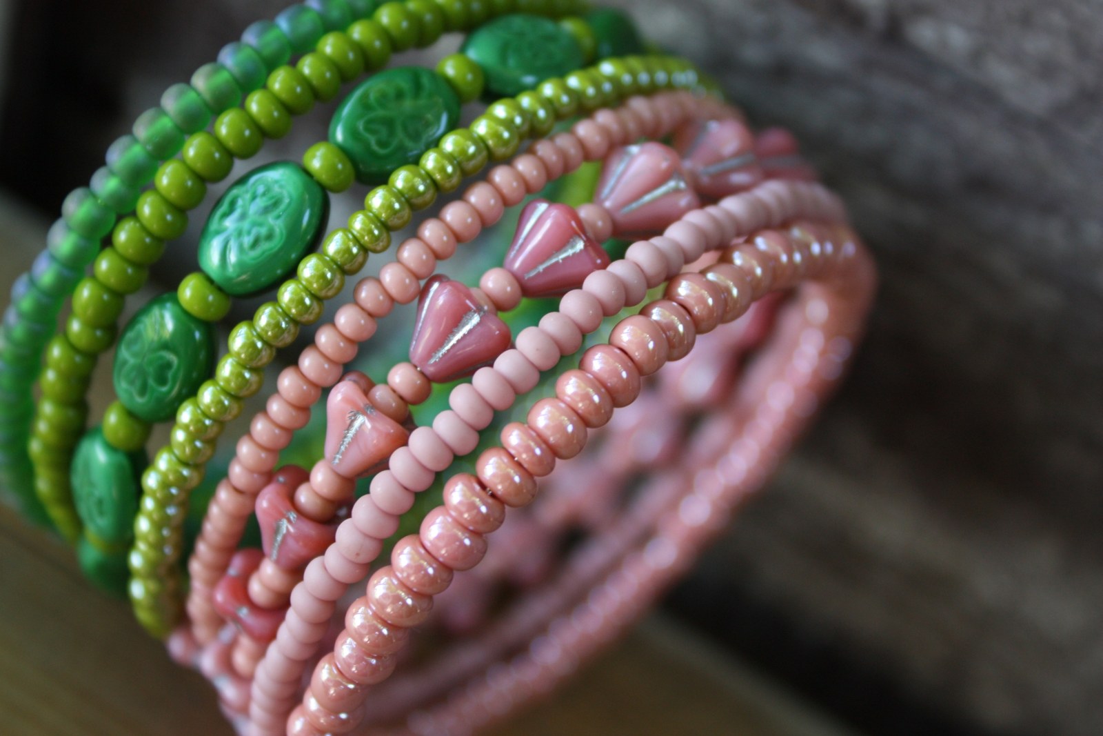 Něžný, zelenkavo-růžovo-fialkový náramek. V návleku skleněné korálky v podobě čtyřlístků a zvonečků, doplněno rokajlem. Paměťový drát o průměru 6 cm.
